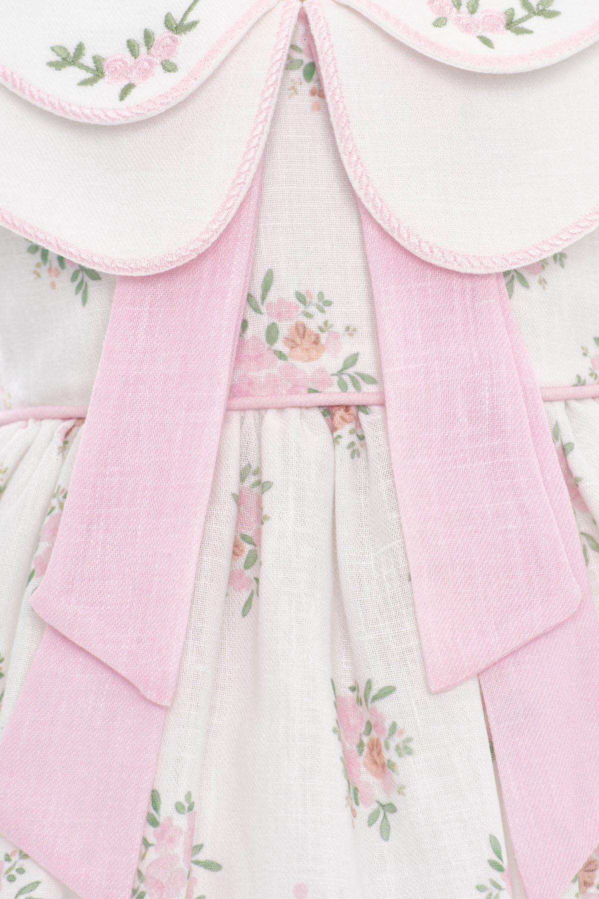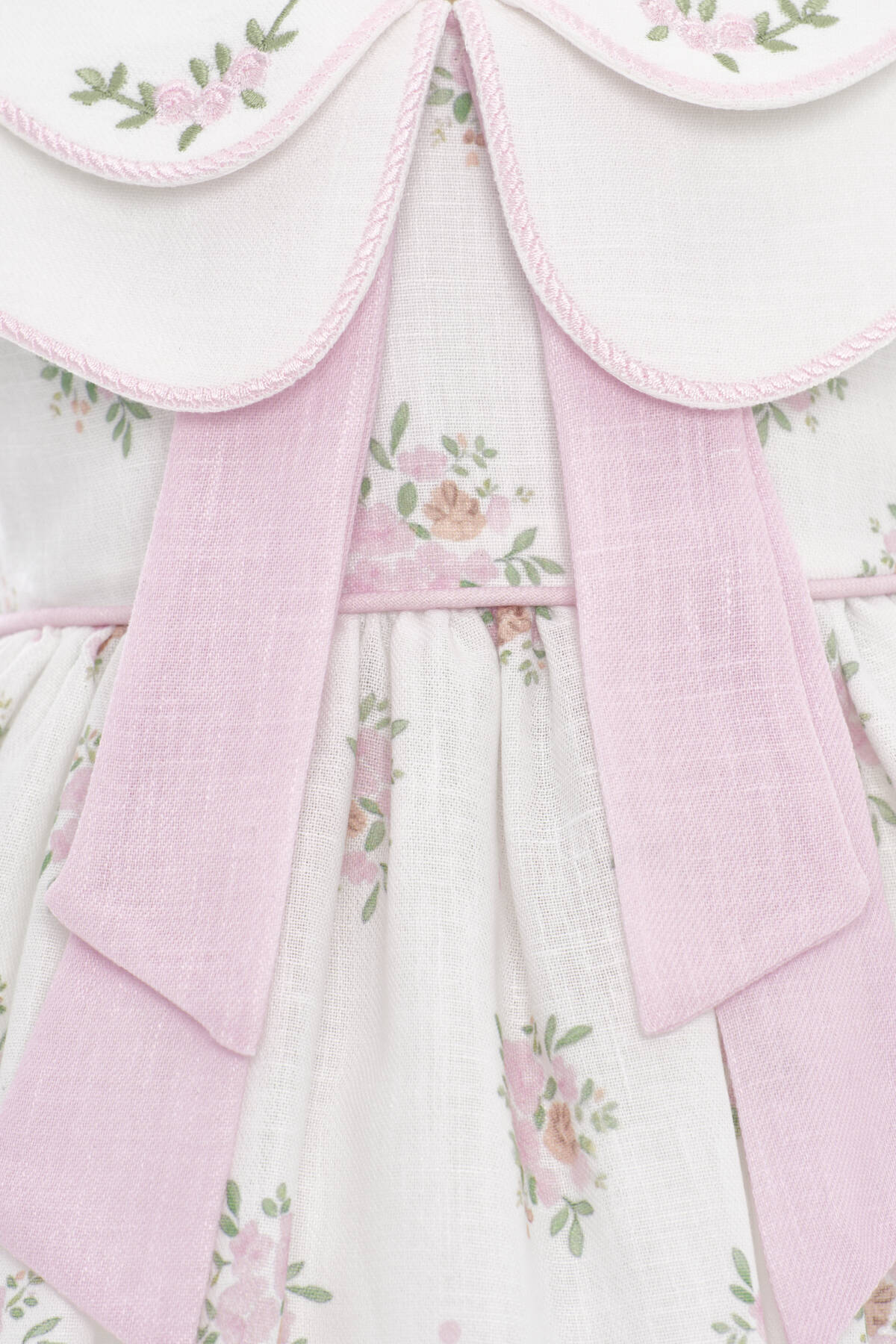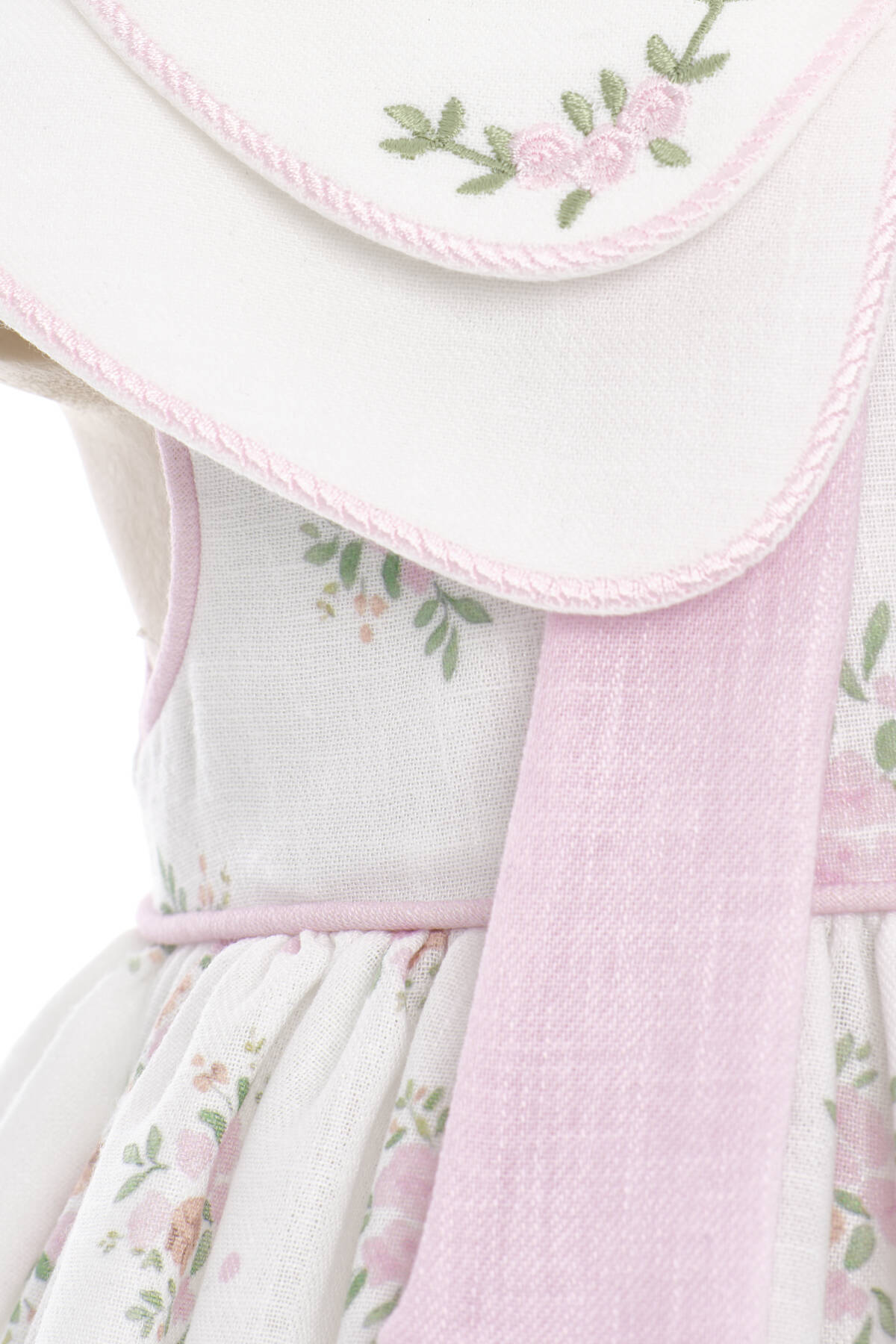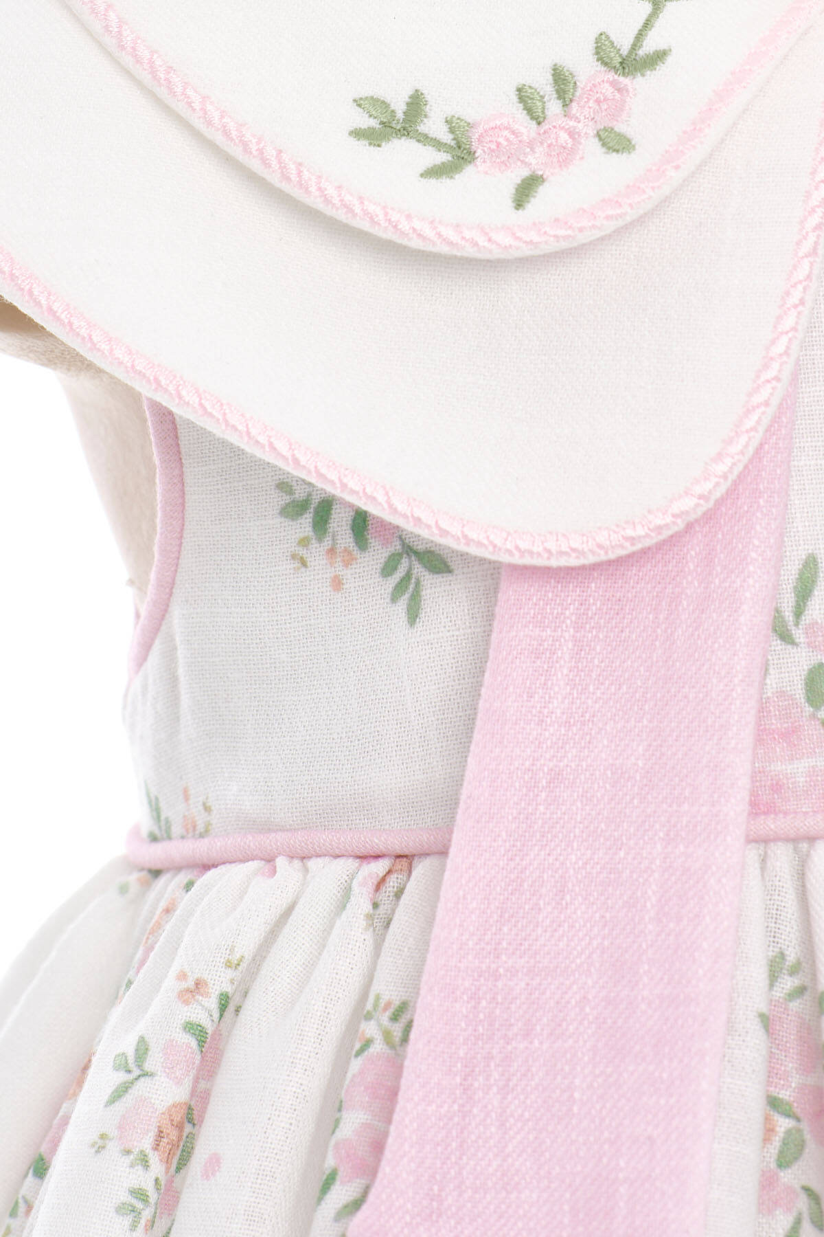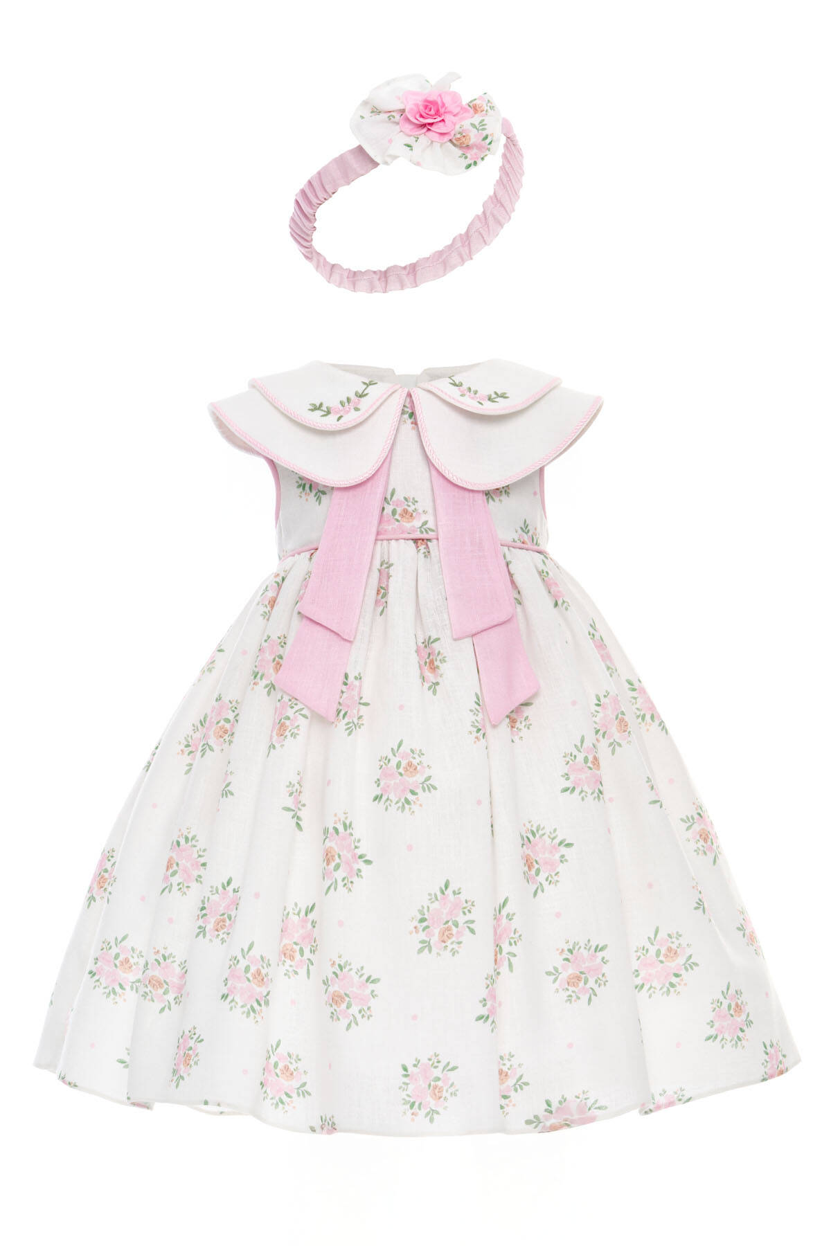A sweet nod to timeless charm—this vintage-inspired baby dress is made for magical moments and first celebrations. Crafted from a soft floral-printed fabric, the dress features a wide double collar delicately embroidered with mini blooms and trimmed with pastel piping. The highlight is a soft cotton bow that falls gently from the neckline, adding a touch of nostalgia. A matching floral headband with a fabric rosette completes the look, creating a picture-perfect outfit for birthdays, tea parties, or family gatherings.