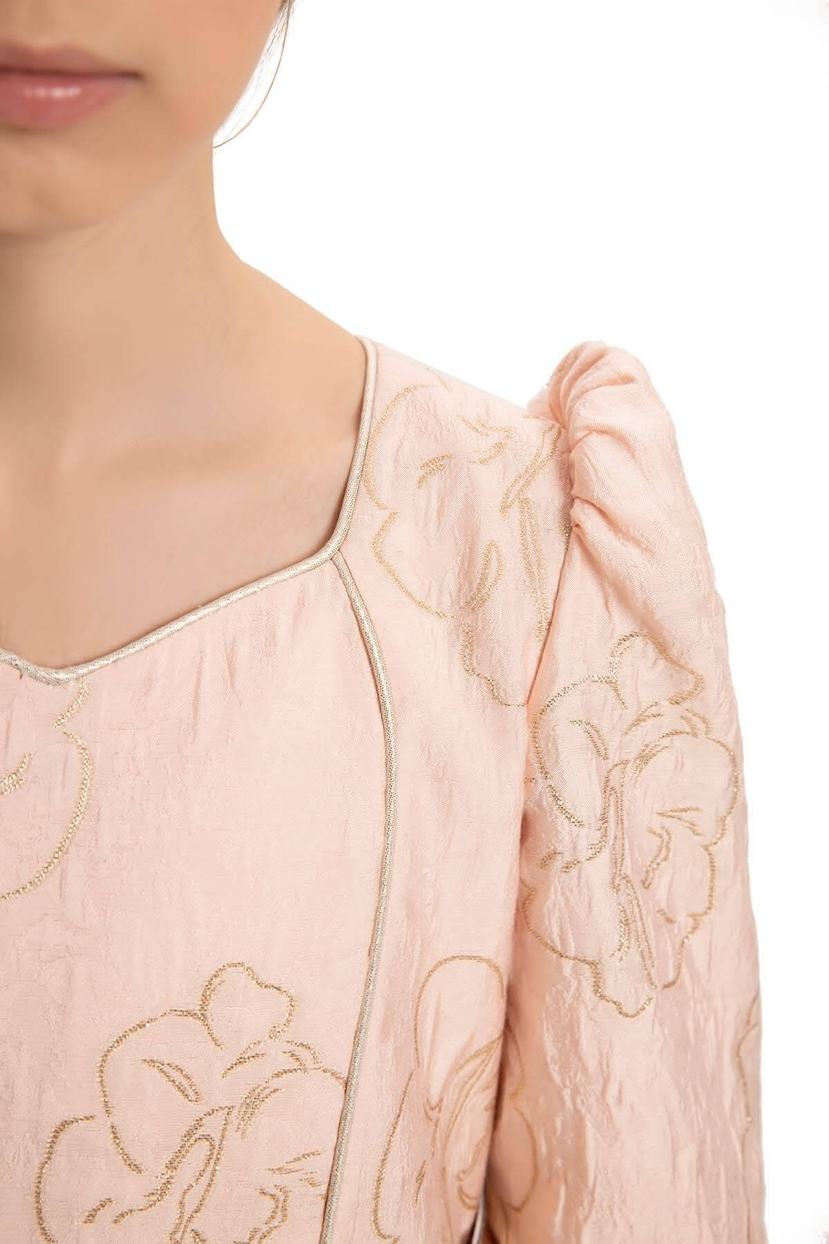 This enchanting brocade dress with a matching bag and belt is designed for young ladies who adore timeless elegance and refined details. A perfect choice for special occasions, this dress combines classic charm with modern sophistication. Made from luxurious brocade fabric with a delicate floral motif highlighted by subtle metallic threadwork, adding a touch of sparkle to the design. Long sleeves and puffed shoulders for a regal, vintage-inspired look. A lace-up corset detail at the back adds an element of customization and charm.
