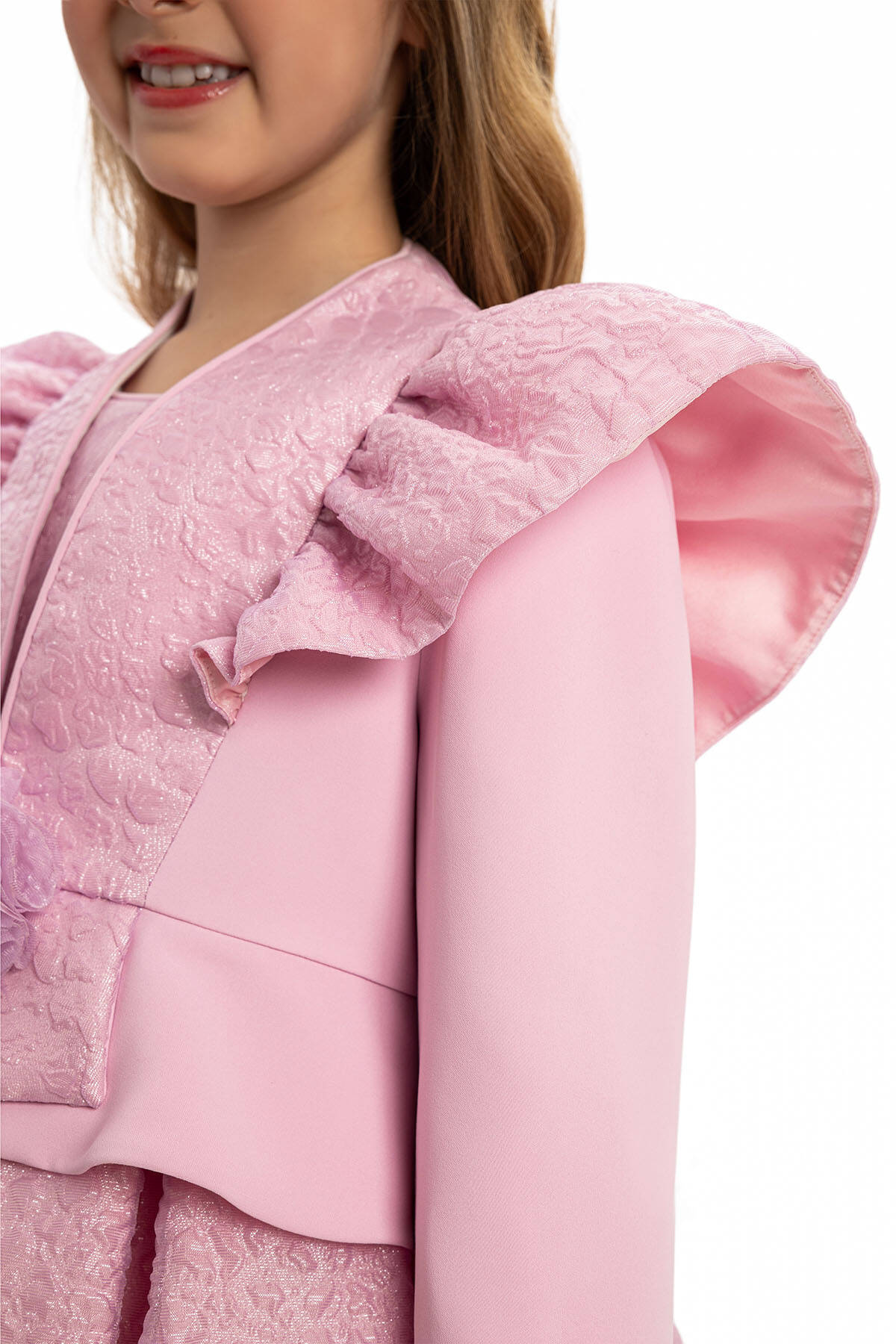 Elevate your little one's style with this enchanting three-piece set, perfect for special occasions. This set includes a sleeveless dress, a stylishly ruffled jacket, and a matching hair accessory. The pastel tones of ecru, powder, and blue add a touch of elegance, while the exquisite floral embellishments and bow accents complete the look. Designed with lightweight and comfortable fabrics, this set ensures your child feels and looks her best all day long, whether at weddings, birthdays, or celebrations.