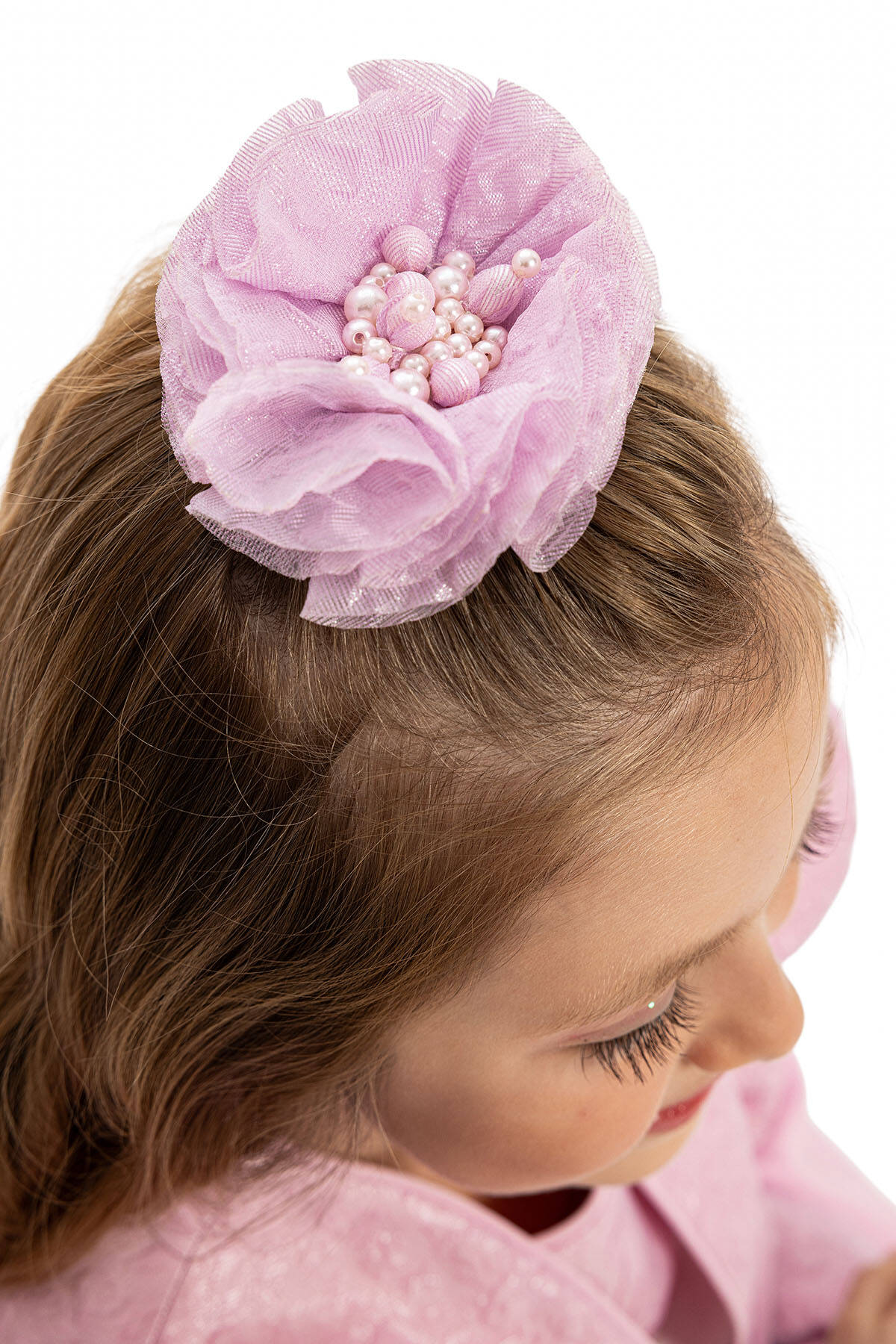 With jacket and hair accessory