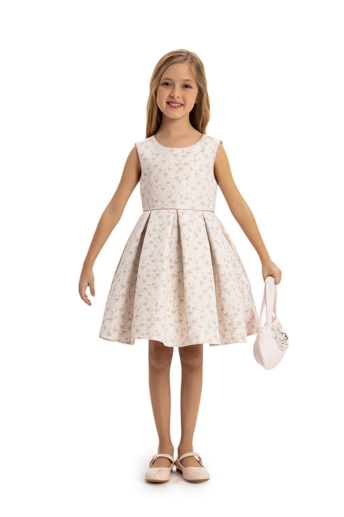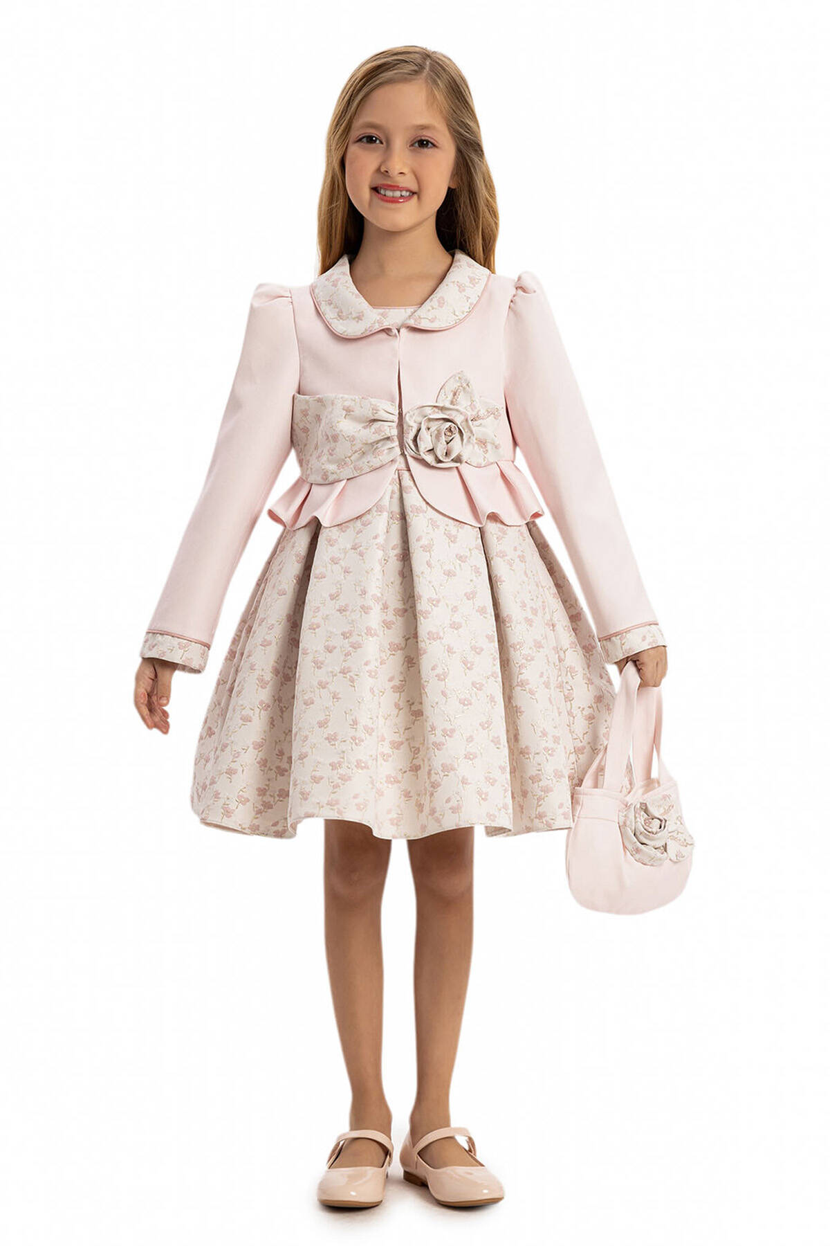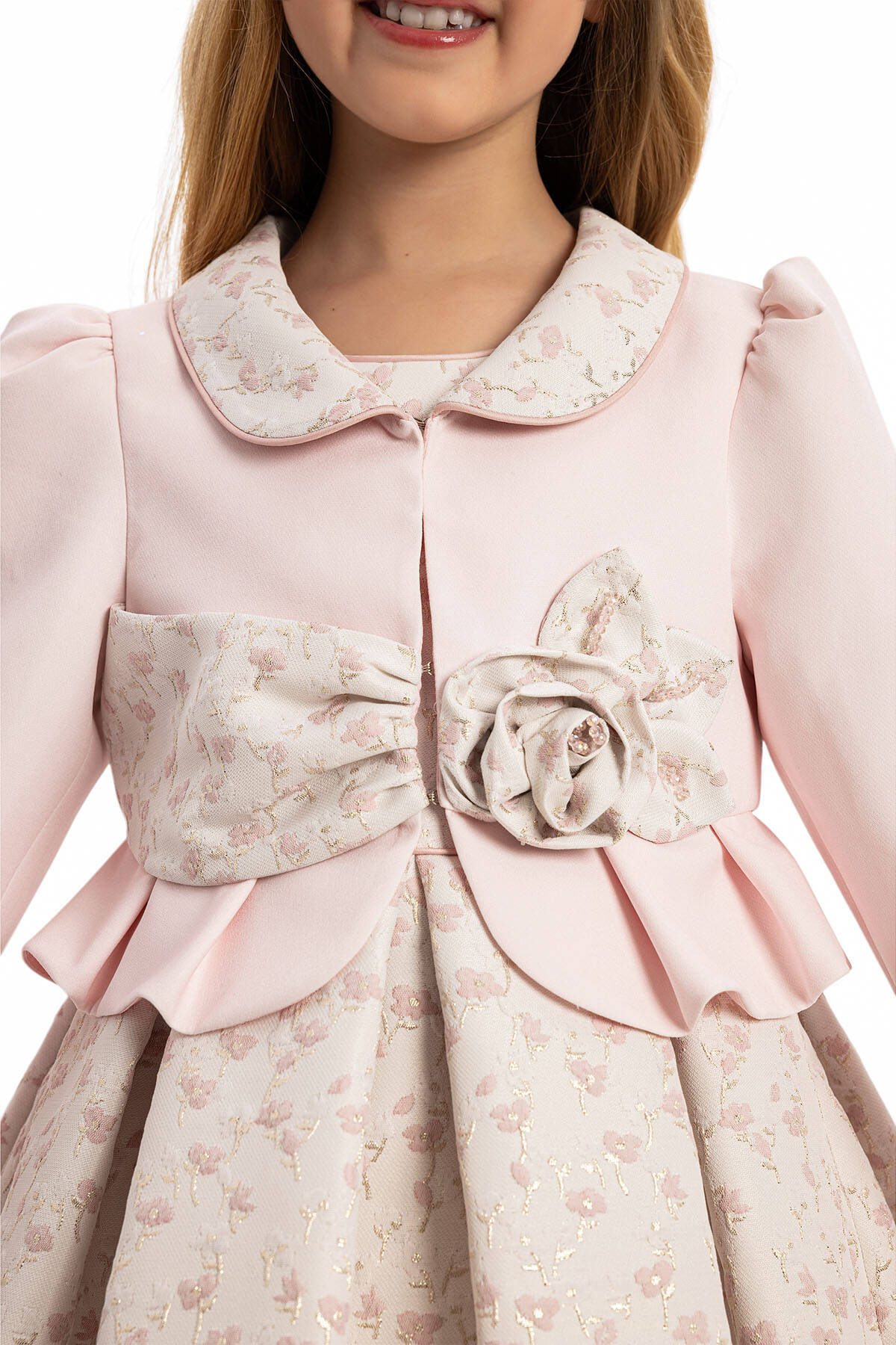 This elegant 3-piece set, including a dress, a chic jacket, and a delightful hair accessory, is perfect for adding a touch of grace to your little girl's wardrobe. Ideal for special occasions, this ensemble combines timeless design with superior craftsmanship. The dress is crafted from premium jacquard fabric featuring delicate floral patterns with subtle metallic accents, ensuring both style and durability.