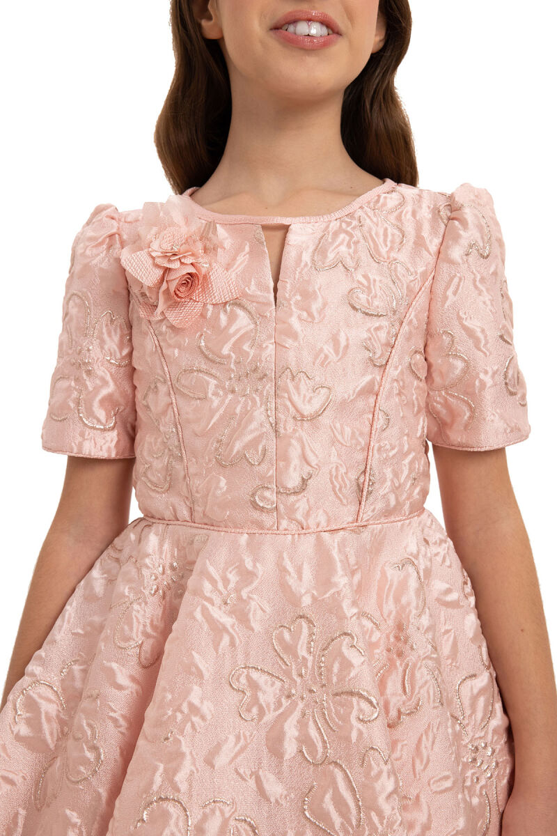 This stunning two-piece set, consisting of an elegant dress and a matching bag, is perfect for young ladies who love to shine at special events. The dress is crafted from luxurious jacquard fabric, featuring an intricate floral pattern with subtle shimmering details. Its short puff sleeves and tailored bodice create a timeless silhouette, while the lace-up back ensures a perfect, adjustable fit. The set is completed with a stylish matching bag adorned with a bow detail, providing both practicality and charm.