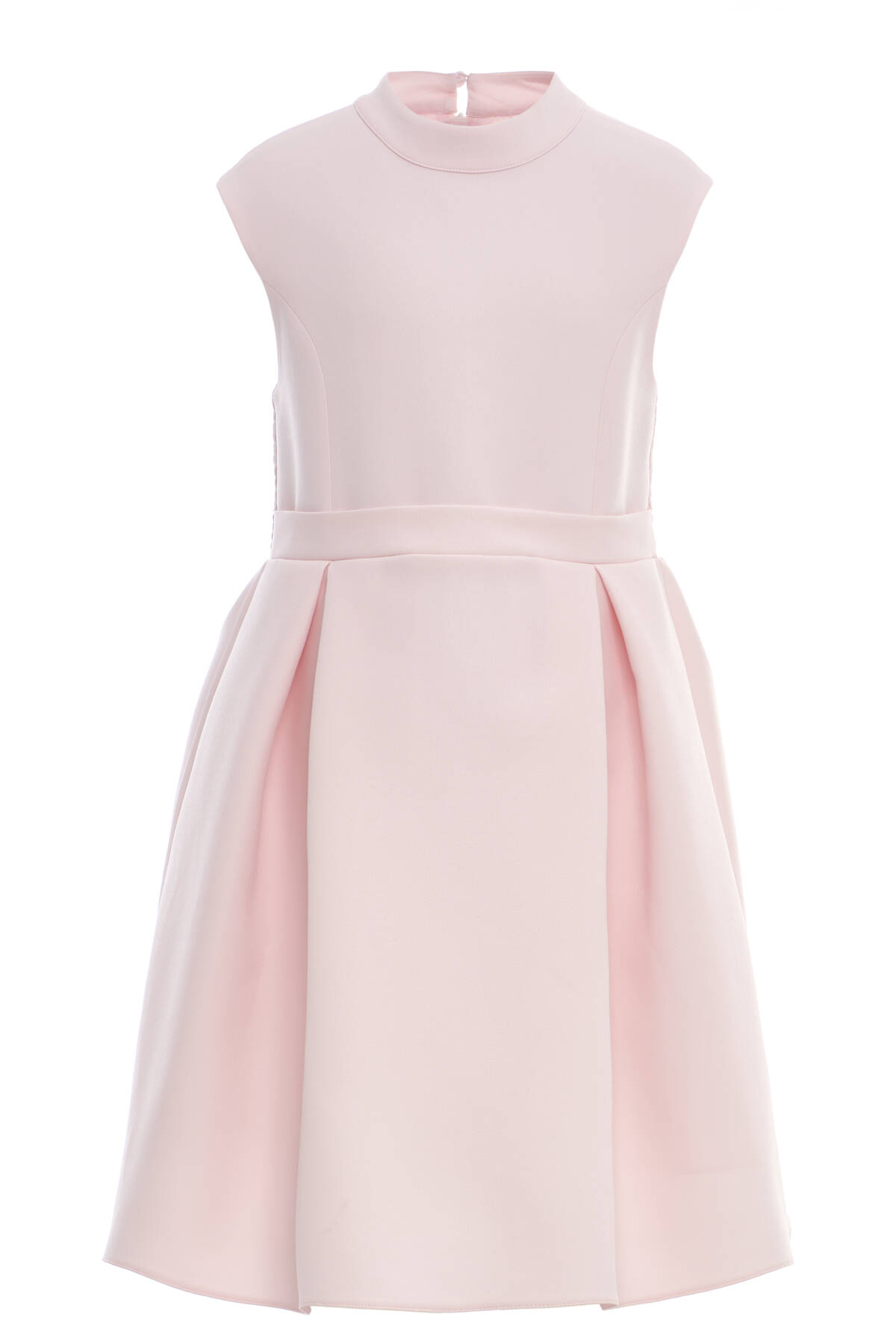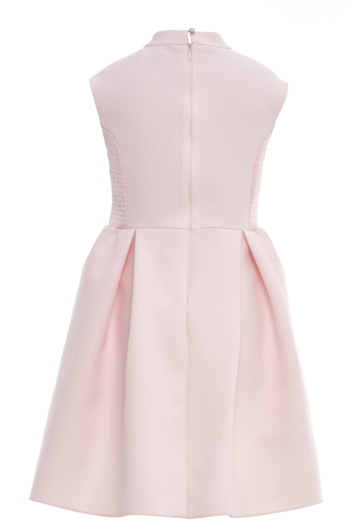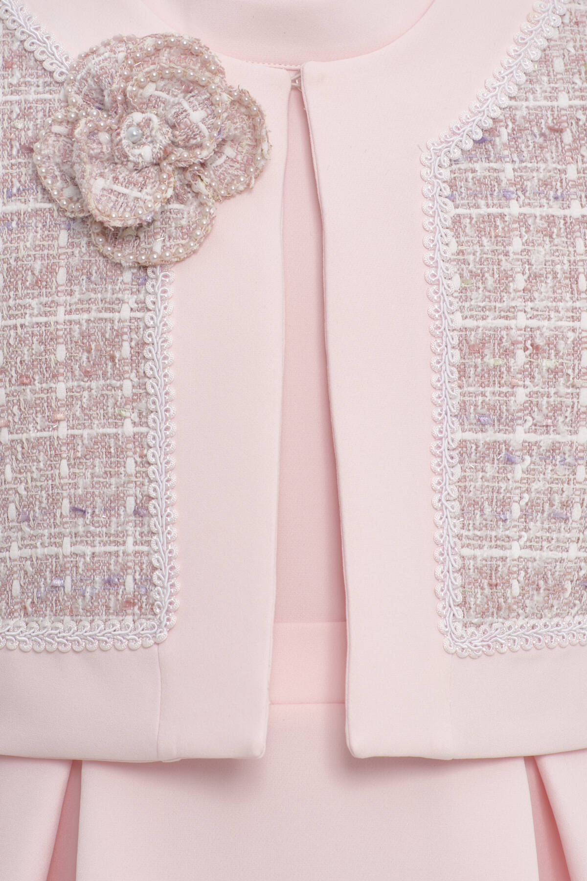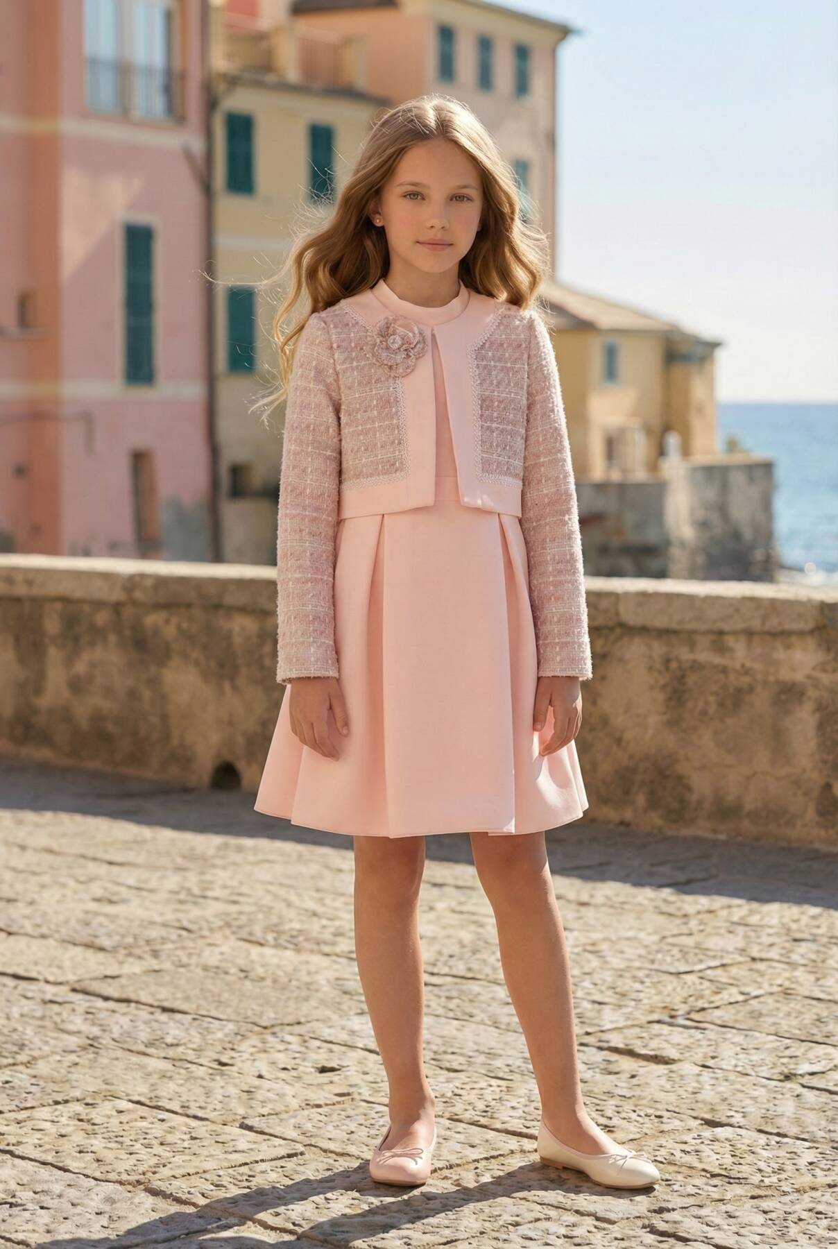 An elegant and fresh design for girls who adore timeless fashion. This two-piece set includes a sleeveless satin dress with a gently structured silhouette and box pleats that add fullness and grace. The side shirring ensures a comfortable fit while maintaining a sleek look.The matching cropped jacket is crafted in soft tweed with shimmering pastel tones and detailed with embroidered trims and a beautiful handcrafted tweed flower brooch. It’s the perfect ensemble for spring celebrations, weddings, or family gatherings—refined yet playful.