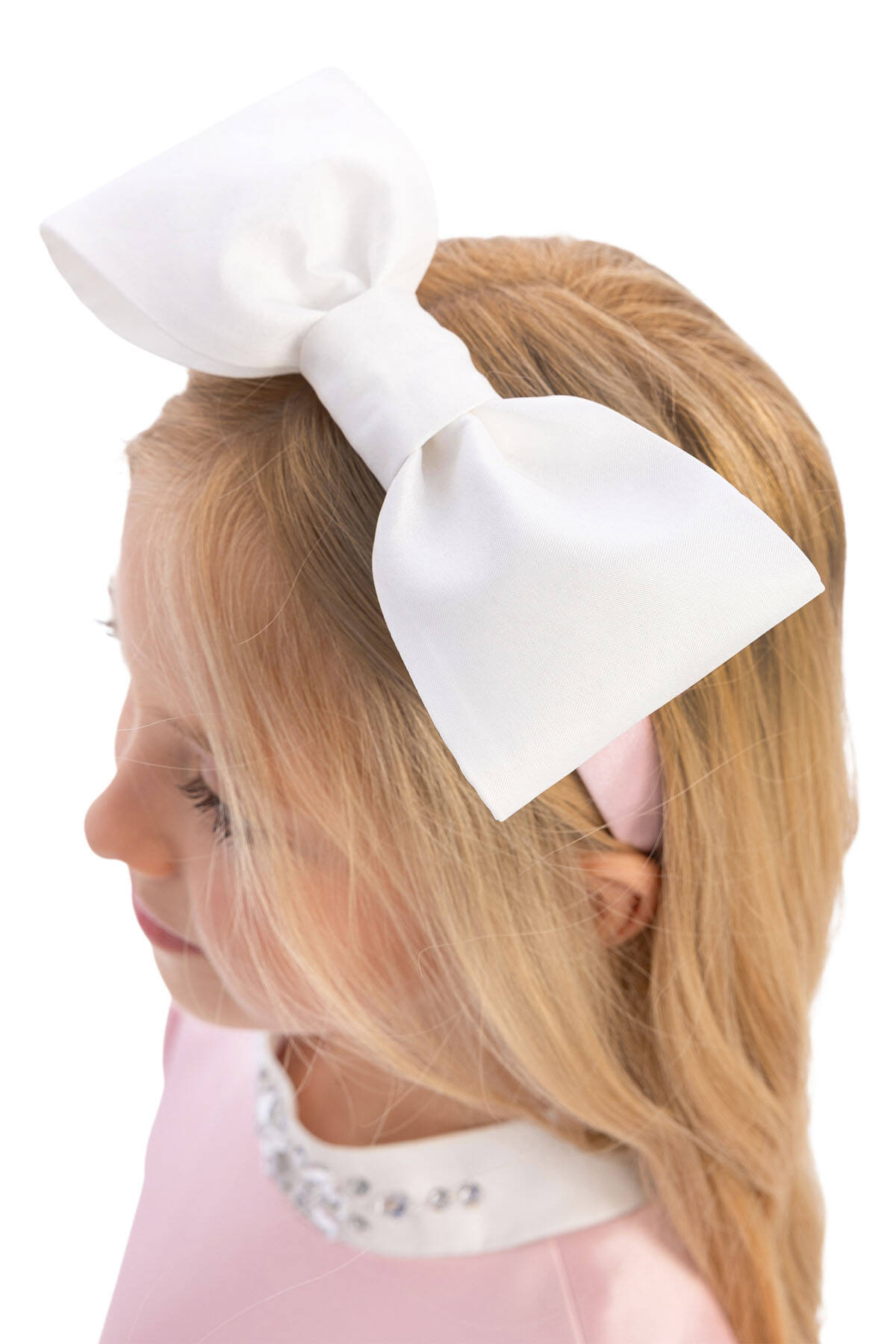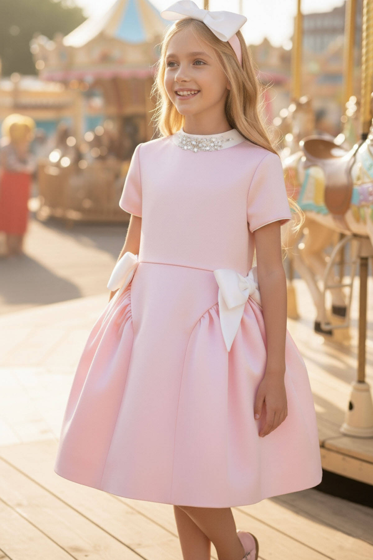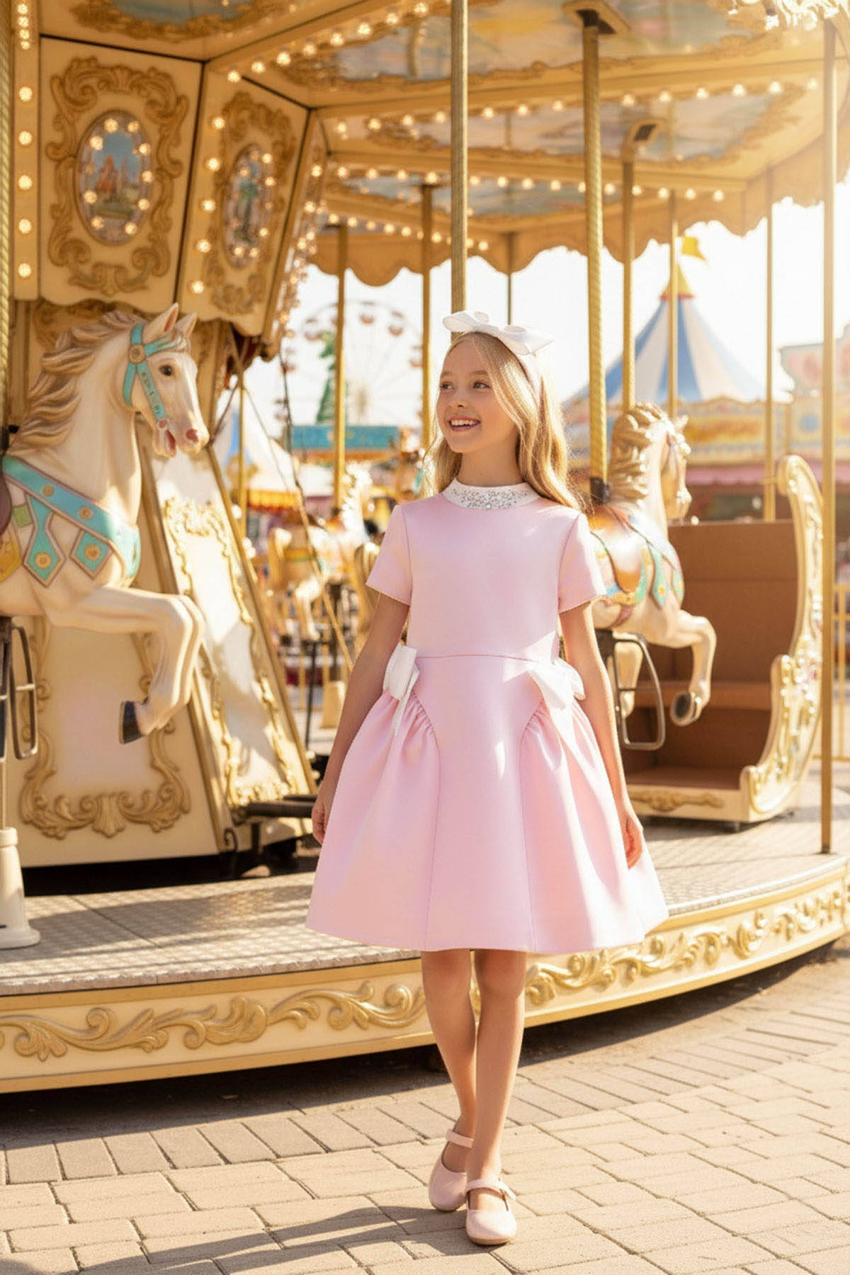 Classic elegance meets modern sparkle in this charming girls' dress set. Designed for special occasions, the dress features a structured silhouette with short sleeves and a gently flared skirt — creating a timeless A-line shape. Its standout details include a refined collar embellished with dazzling crystal stones arranged in floral motifs and two oversized satin bows at the waist, offering a graceful contrast in both texture and color. The look is completed with a matching oversized bow headband for a perfectly coordinated, show-stopping finish. Ideal for parties, weddings, and celebrations, this dress brings together polish and playfulness for unforgettable moments.