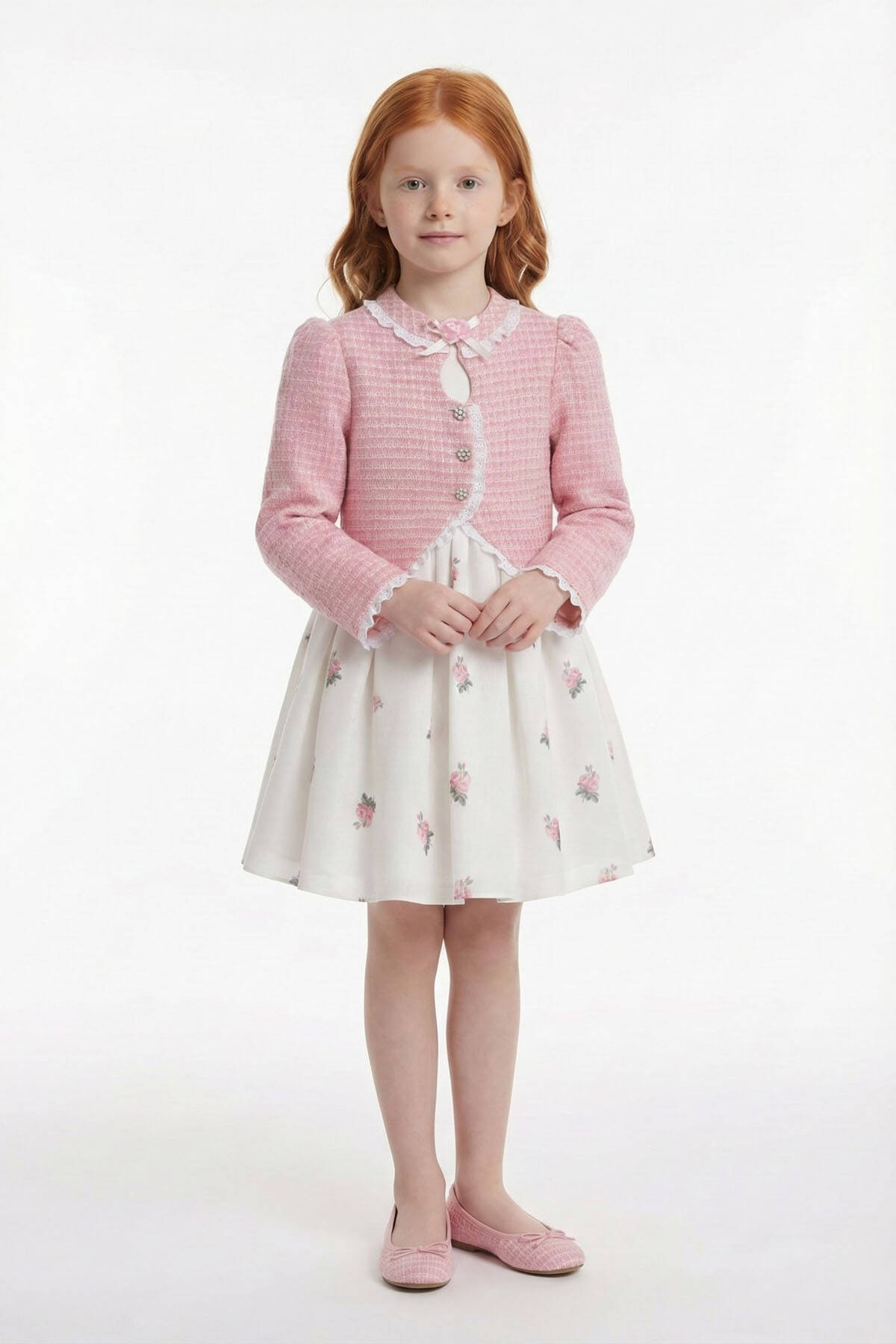 Soft, sweet, and timelessly elegant—this two-piece set is a must-have for little girls who love classic style! The sleeveless floral dress is made from airy fabric and features an all-over rose print, creating a light and graceful silhouette. Layered with the textured tweed jacket, trimmed with lace and pearl flower buttons, it becomes a standout look for any special day. Perfect for spring parties, birthdays, or family celebrations, this coordinated set offers charm, comfort, and versatility in one beautiful ensemble.