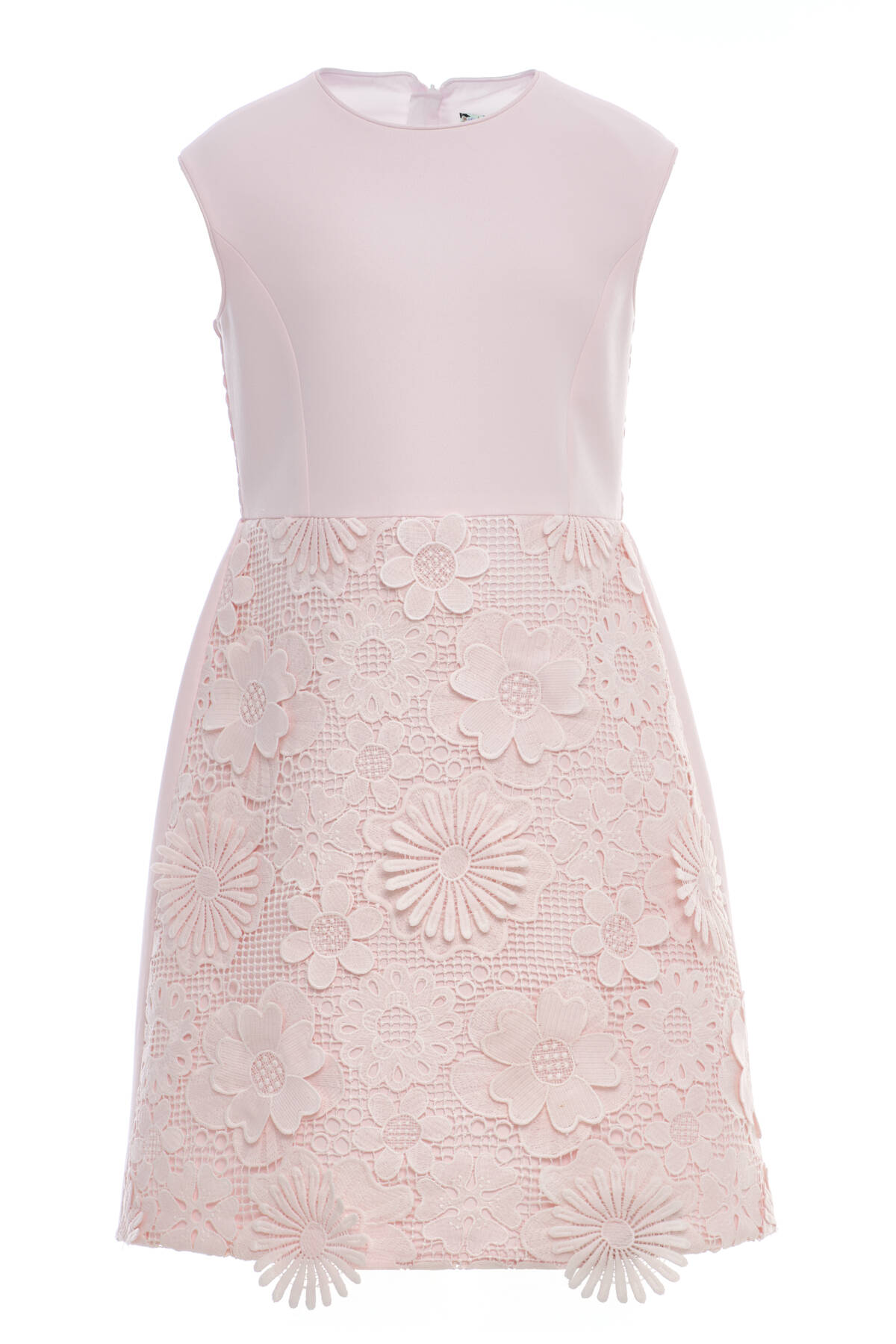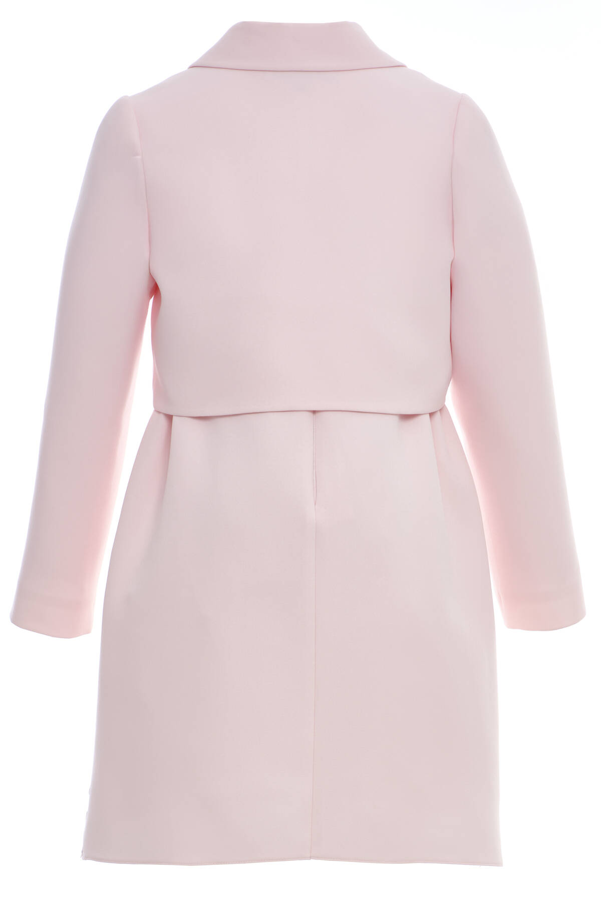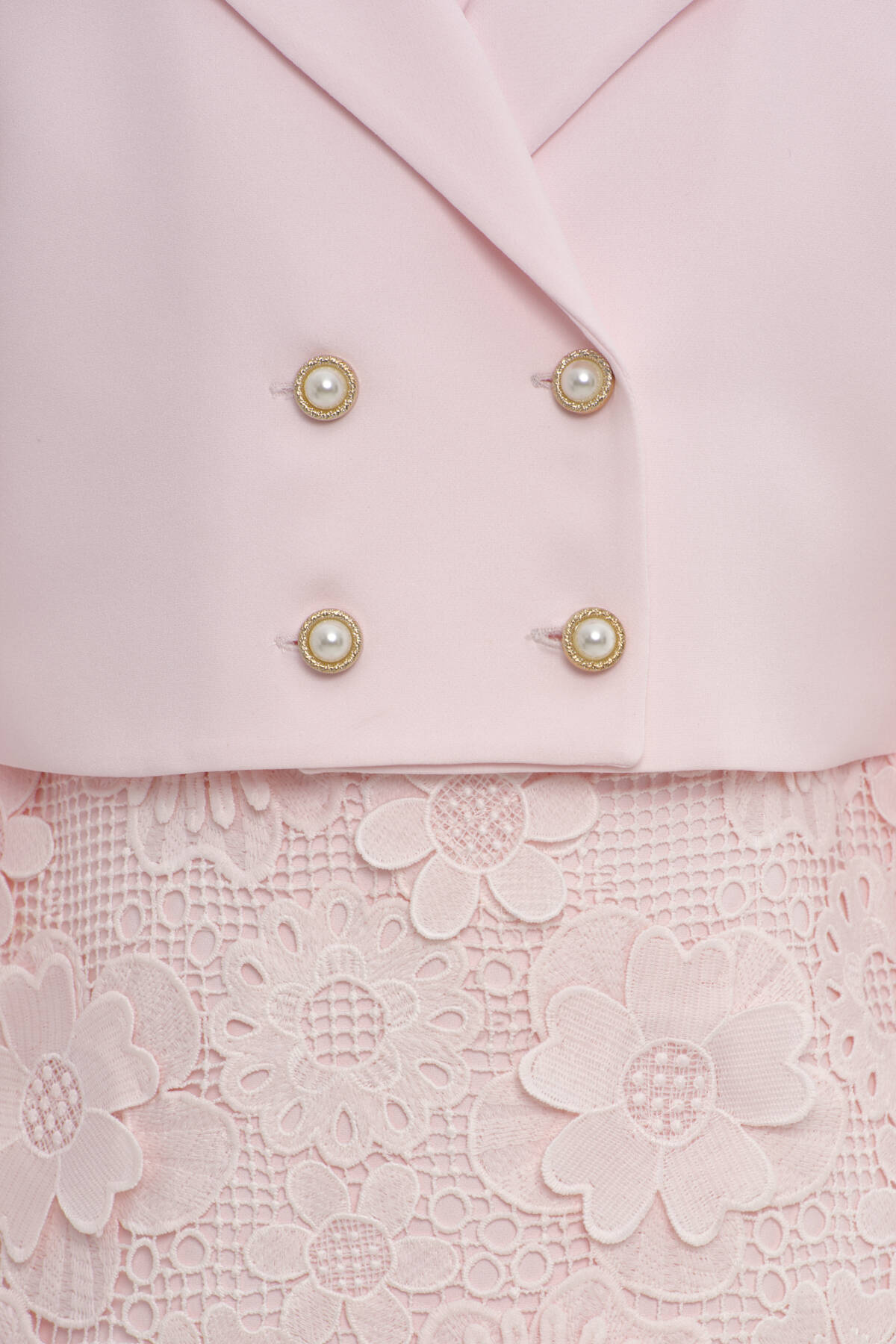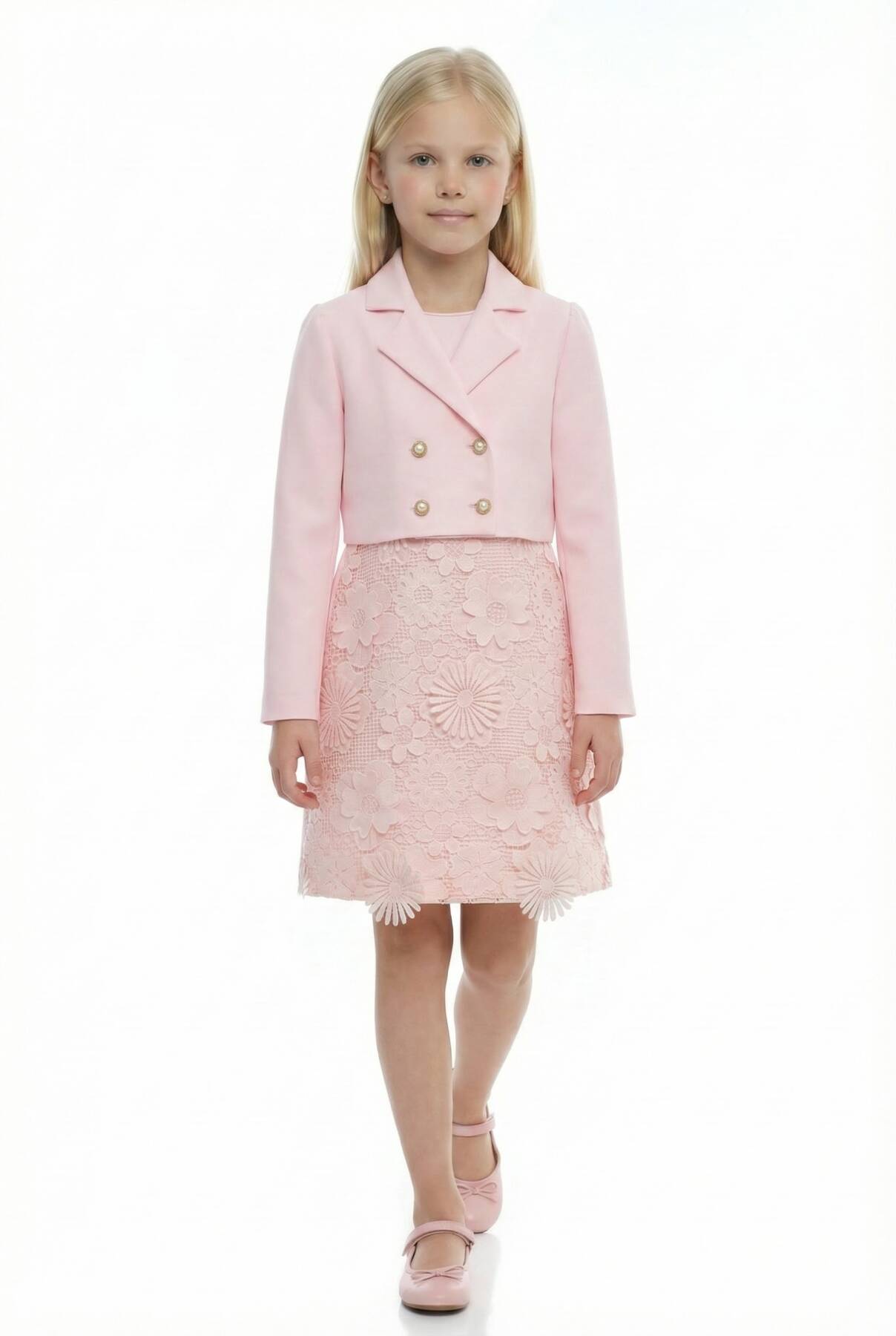 A modern classic for stylish young ladies! This elegant two-piece set features a sleeveless shift dress with an intricate 3D floral lace skirt—soft, textured, and full of charm. The fitted bodice ensures a clean and refined silhouette, while the floral appliqués add playful movement with every step. Paired with a sleek cropped jacket, detailed with pearl-embellished gold buttons and a tailored lapel collar, the set offers a polished look for formal events, holidays, or family celebrations. Understated and graceful, it's a perfect choice for girls who love elegance with a fresh twist.