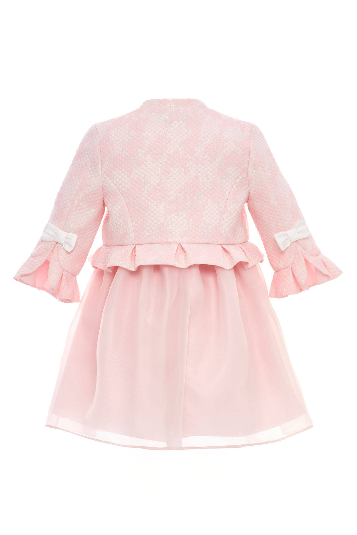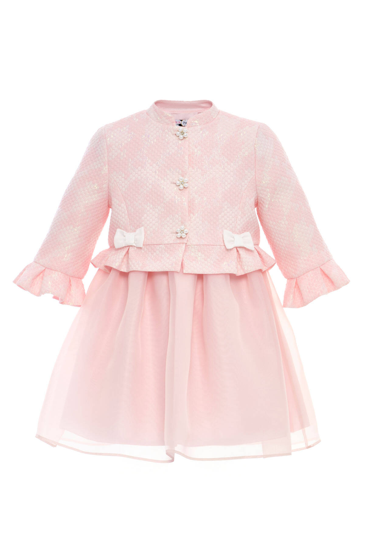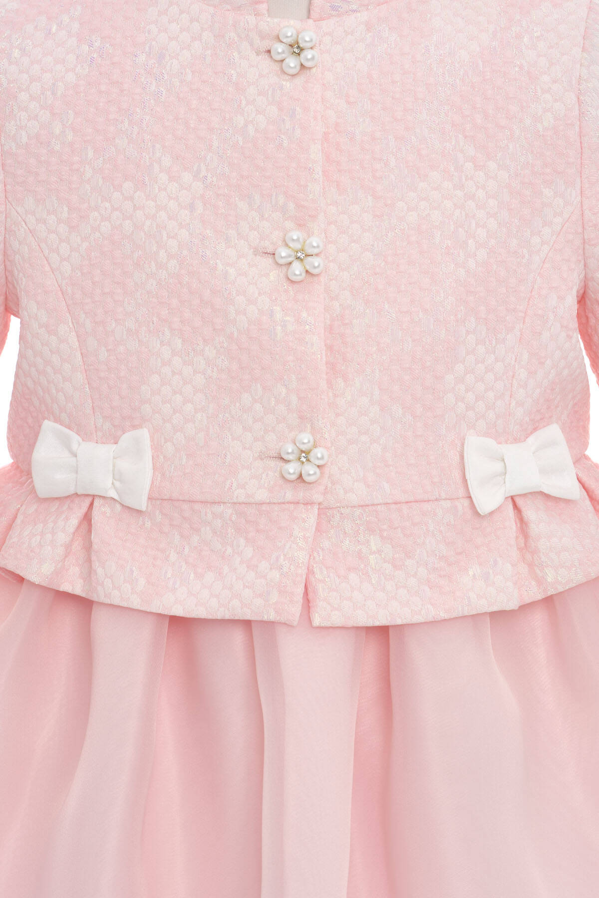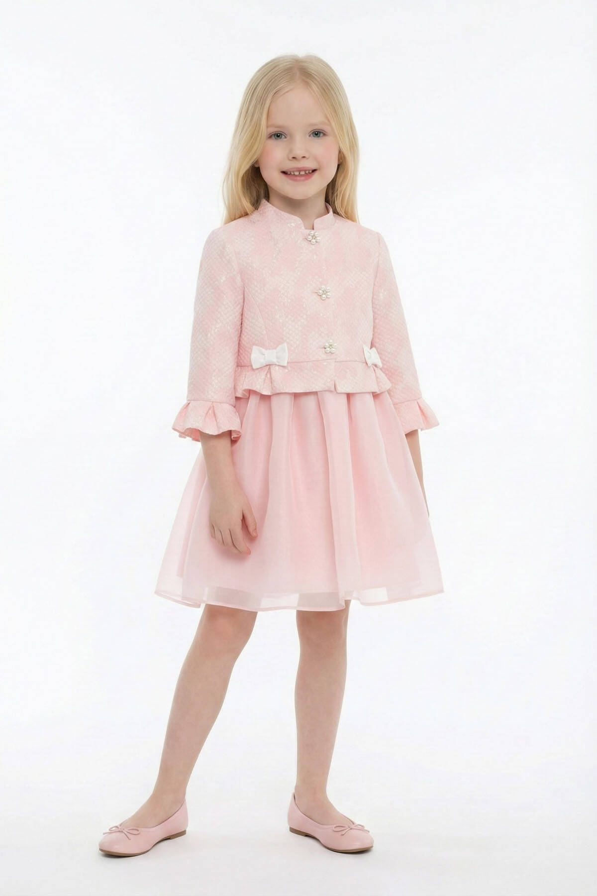 This elegant two-piece set is perfect for little girls who adore a polished look! The sleeveless dress features a voluminous organza overlay skirt that moves beautifully with every step. It pairs seamlessly with a structured textured jacket, finished with pearl flower buttons, double bows, and soft ruffle cuffs for a touch of charm. Ideal for birthdays, spring celebrations, and all her special days, this set blends comfort, sophistication, and timeless beauty in one perfect look.