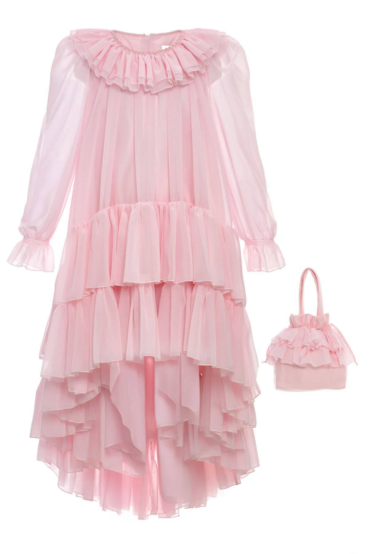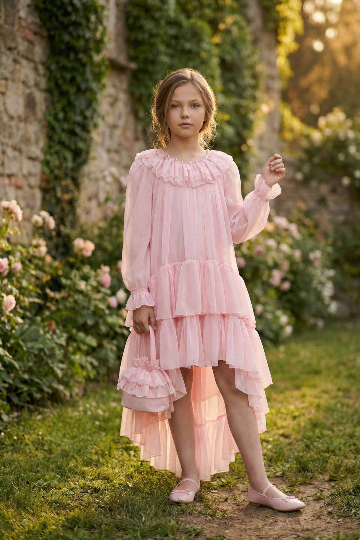 Girls Layered Ruffle Chiffon Dress with Matching Bag (8–14 Age):