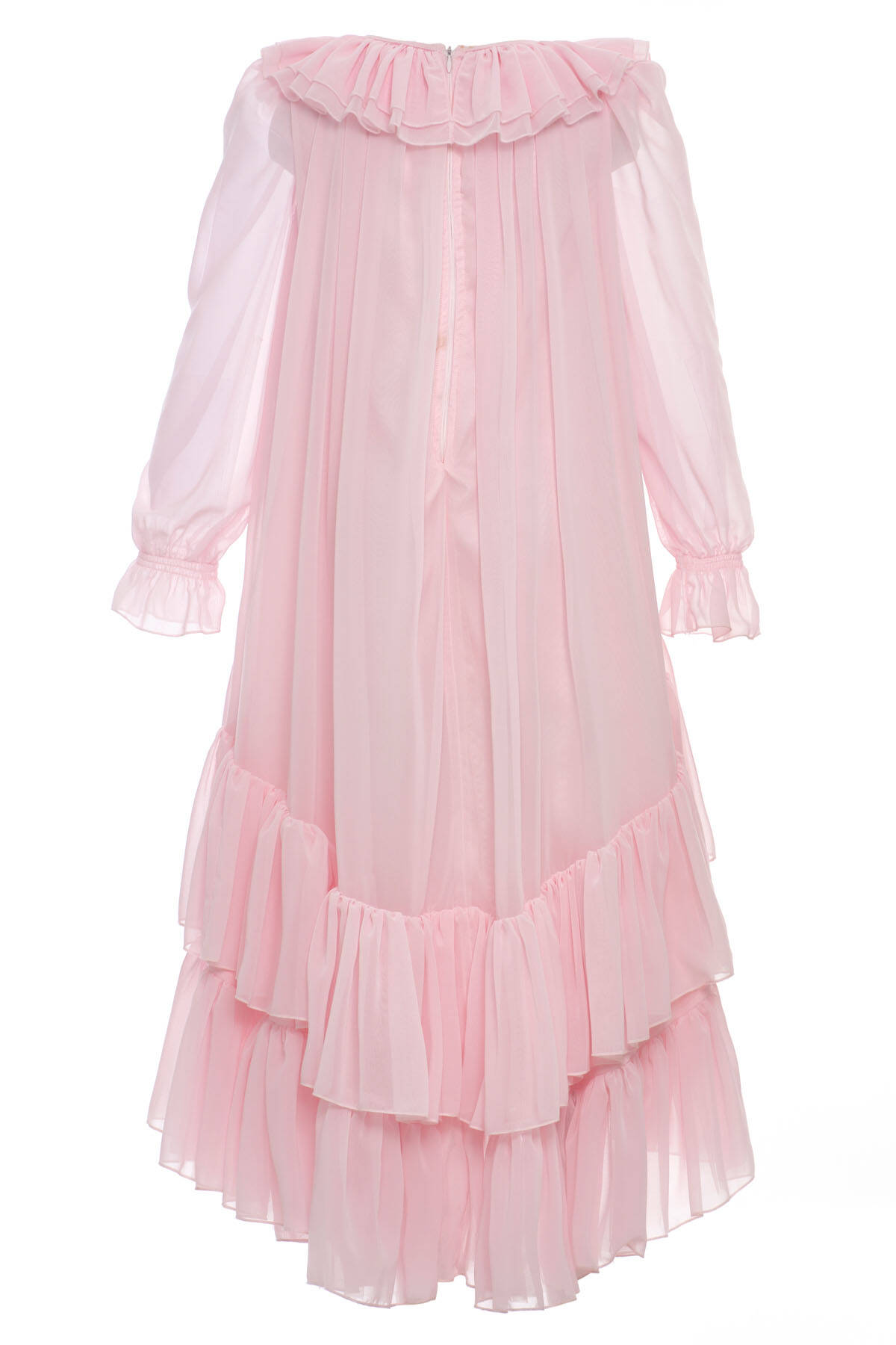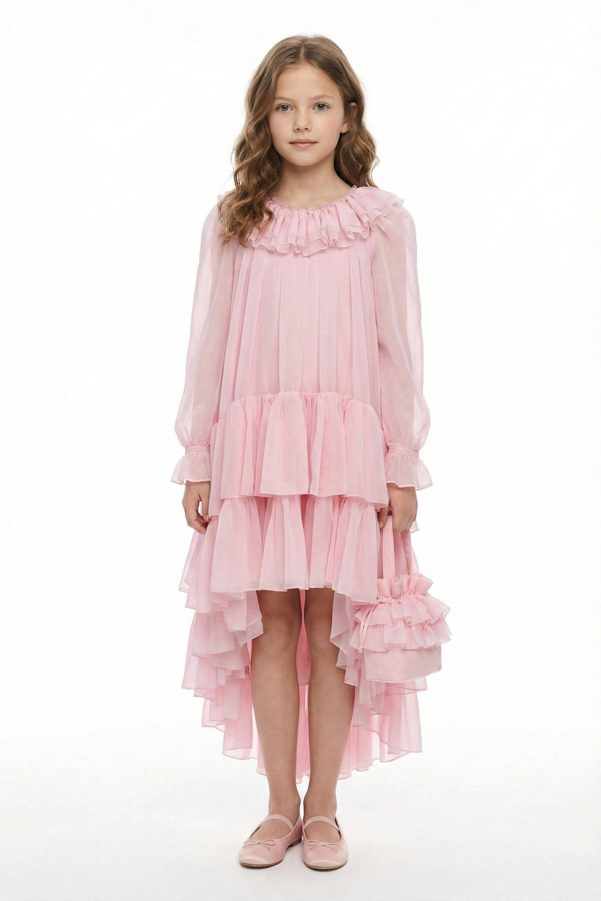A fairytale-inspired ensemble that captures elegance in every flutter. This dreamy long-sleeve dress is made from soft chiffon and designed with cascading ruffle layers that create beautiful movement and volume. The off-shoulder neckline is gently ruffled and finished with delicate bead embellishments, adding a hint of sparkle to the romantic silhouette.To complete the look, the dress comes with a matching ruffled chiffon handbag. Perfect for little essentials and full of charm. A standout choice for birthdays, ceremonies, or any celebration that calls for a magical moment.