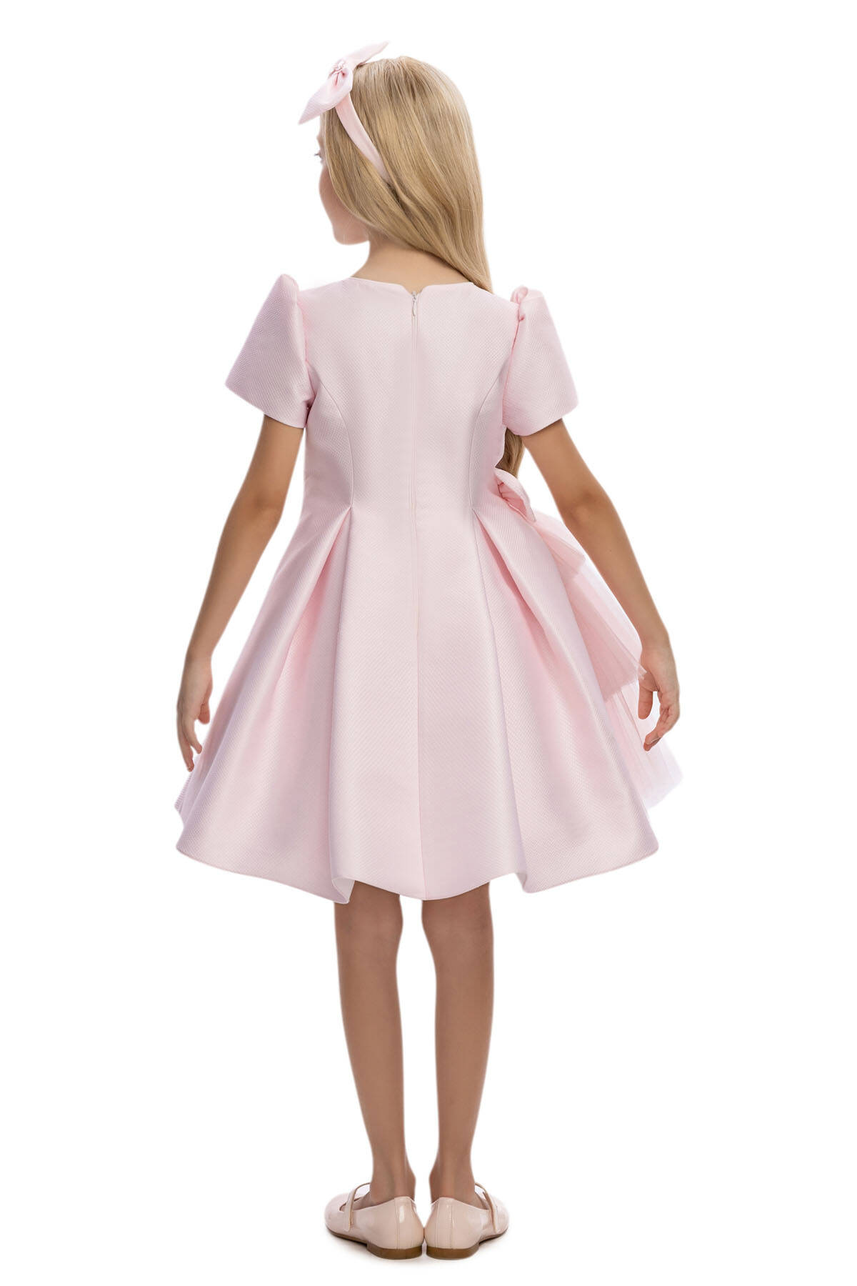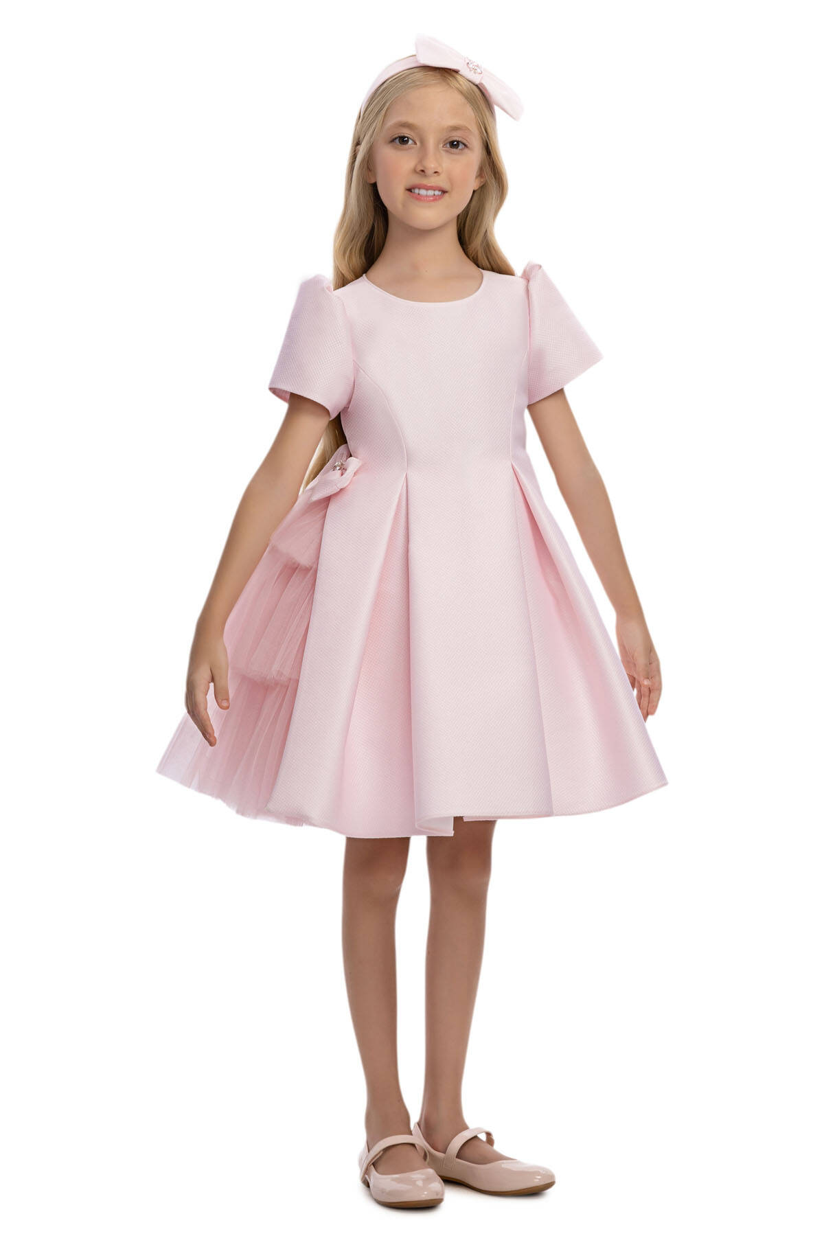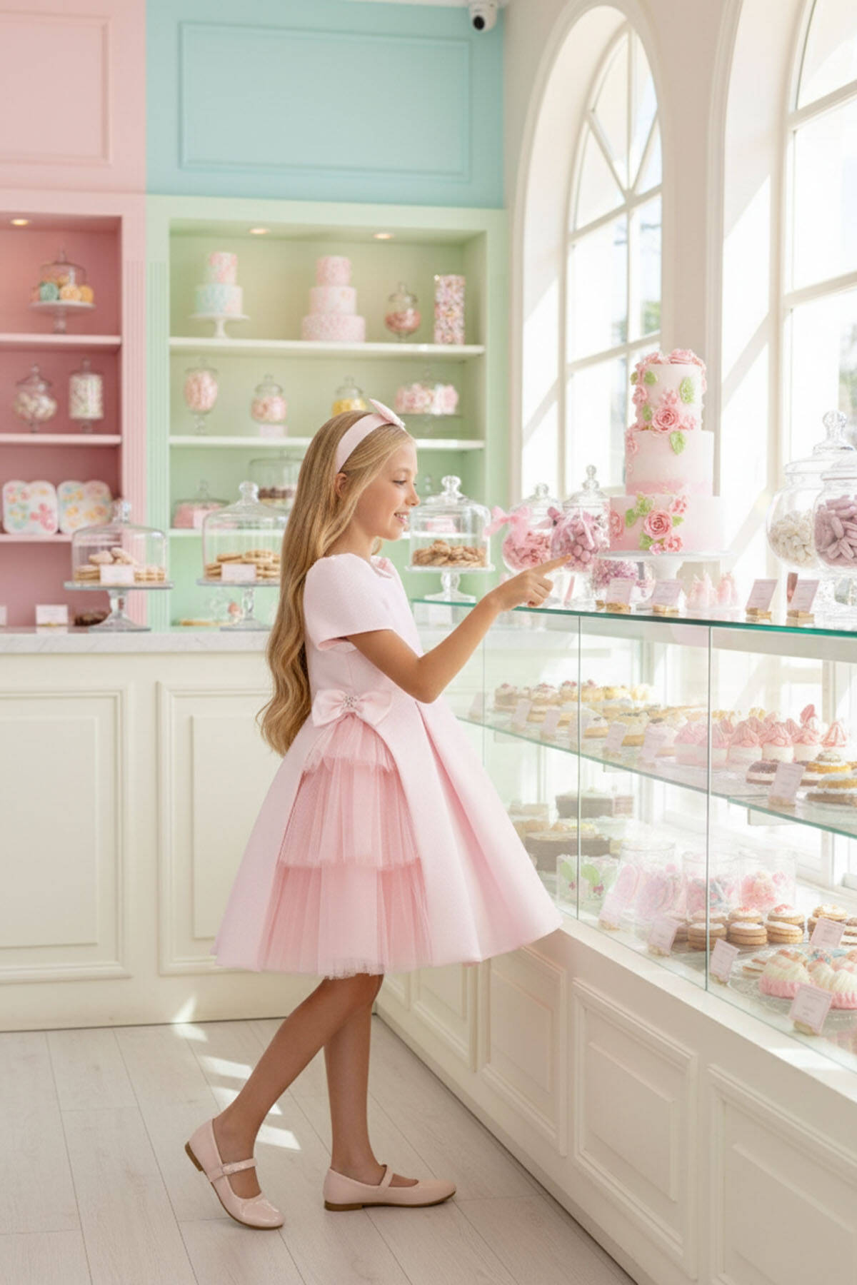 Whimsical elegance with a playful twist! This party-ready dress combines a structured silhouette with dreamy details, making it a standout choice for little fashion stars. The softly flared skirt is elevated with a side-layered tulle panel, creating gentle volume and graceful movement. A statement satin bow with jewel embellishment sits at the hip, perfectly complemented by the matching oversized headband. Perfect for birthdays, weddings, or sweet afternoon outings, this set delivers charm, style, and sparkle all in one.