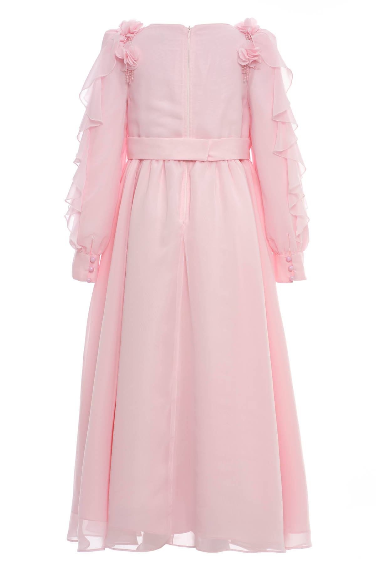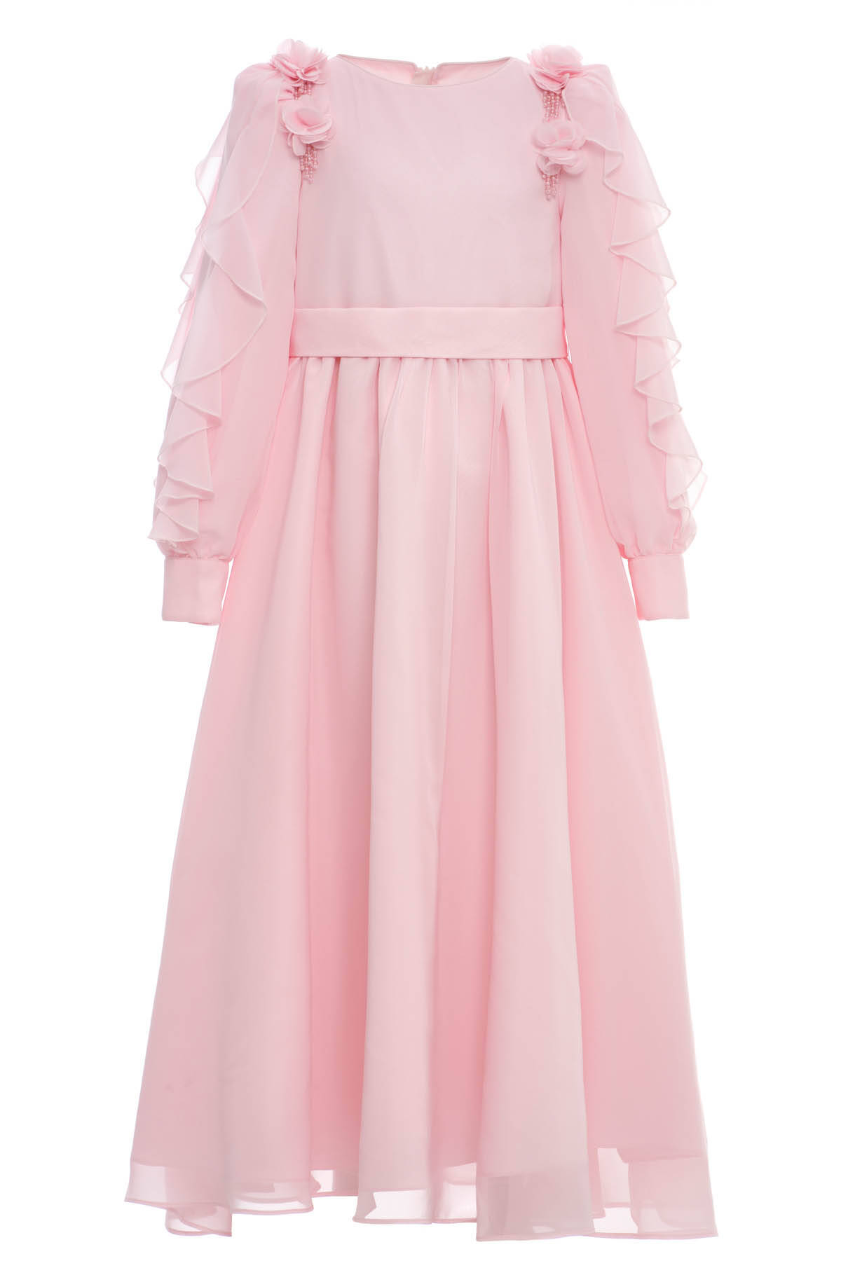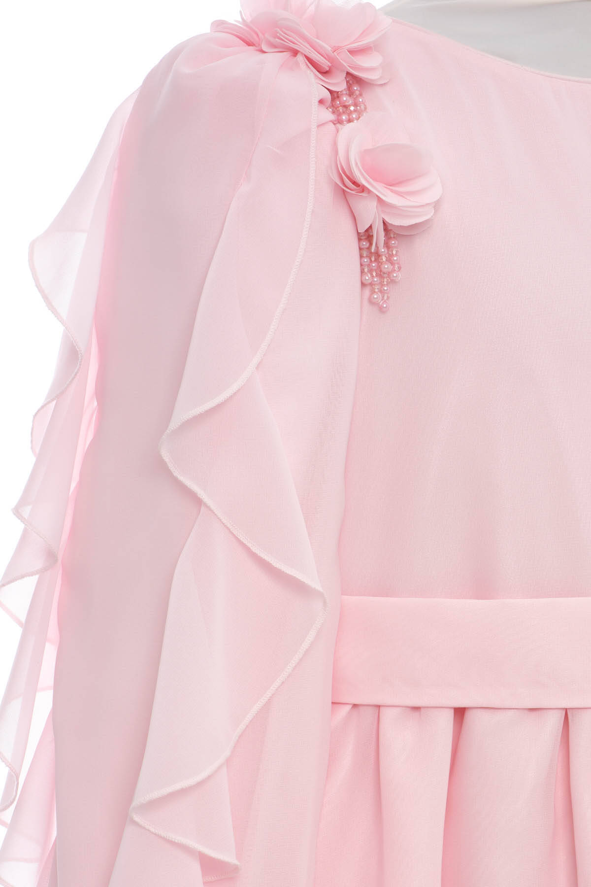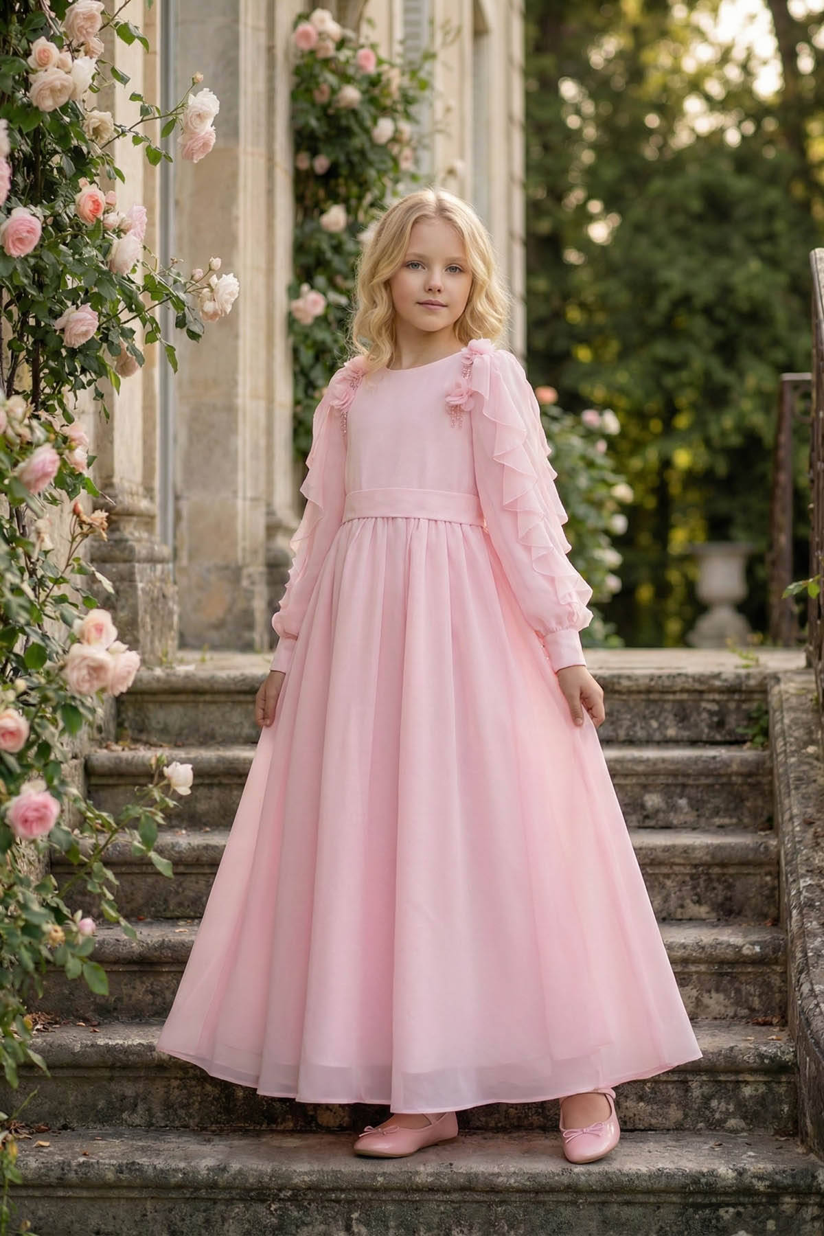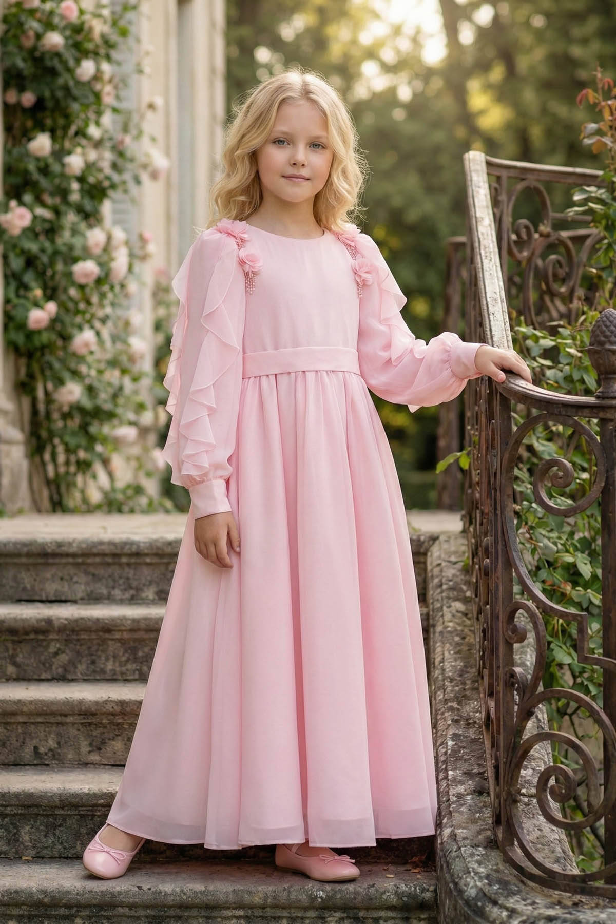 Soft, flowing, and beautifully detailed—this chiffon dress is designed to bring elegance and grace to any special occasion. The long A-line silhouette is elevated with layered ruffle sleeves and delicately gathered skirt panels, creating movement with every step. Charming 3D chiffon flowers sit gracefully on the shoulders, accented by cascading pearl bead strands for a refined, feminine finish. Perfect for weddings, ceremonies, or seasonal celebrations.