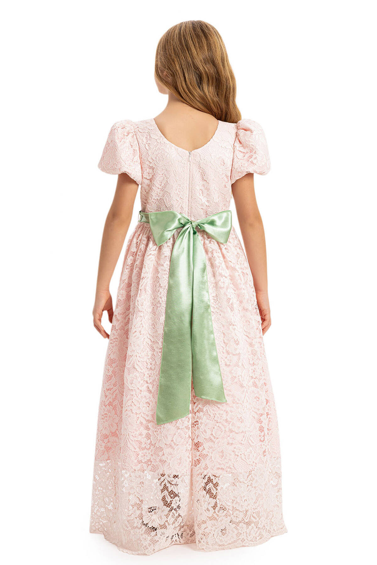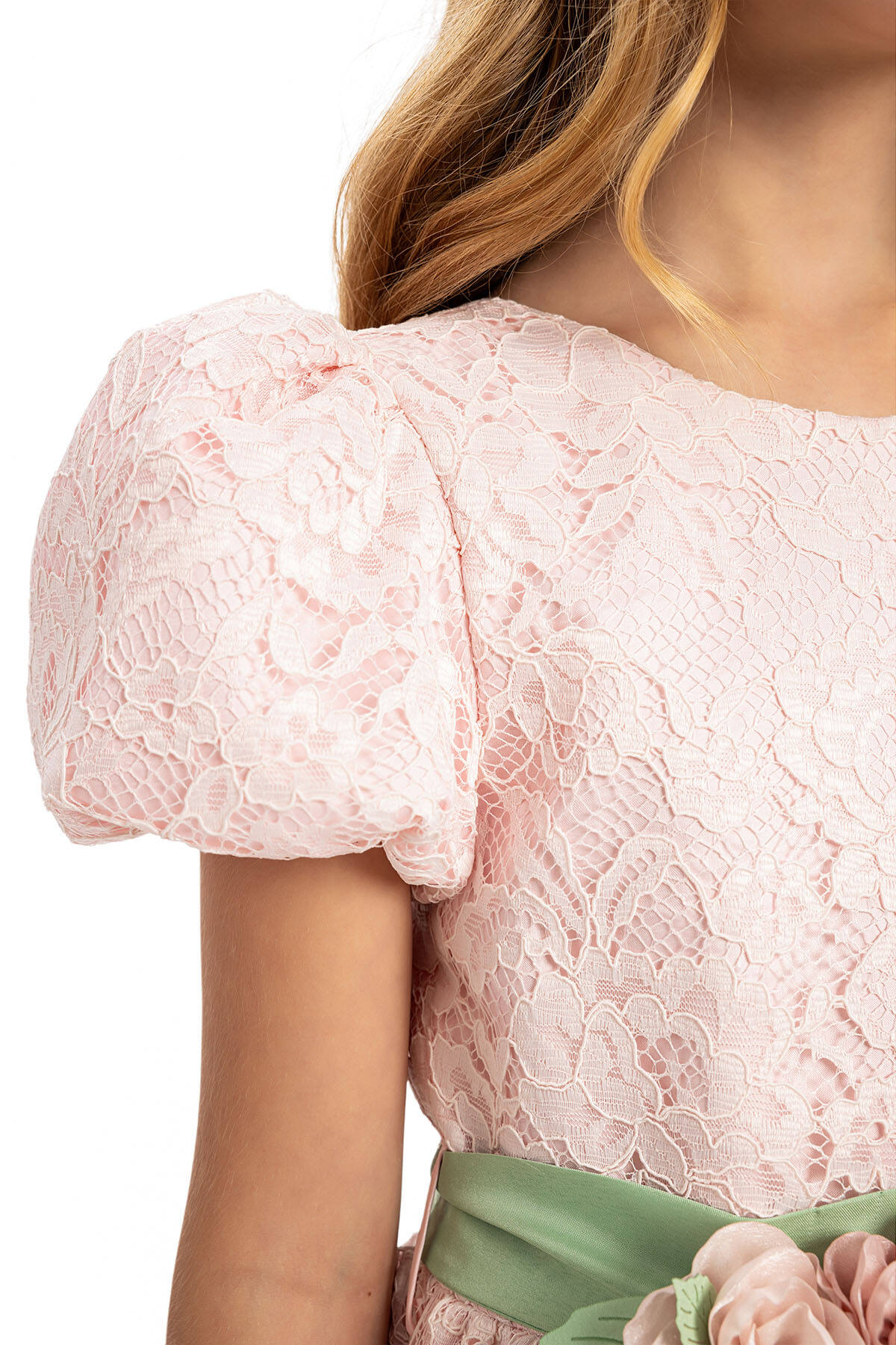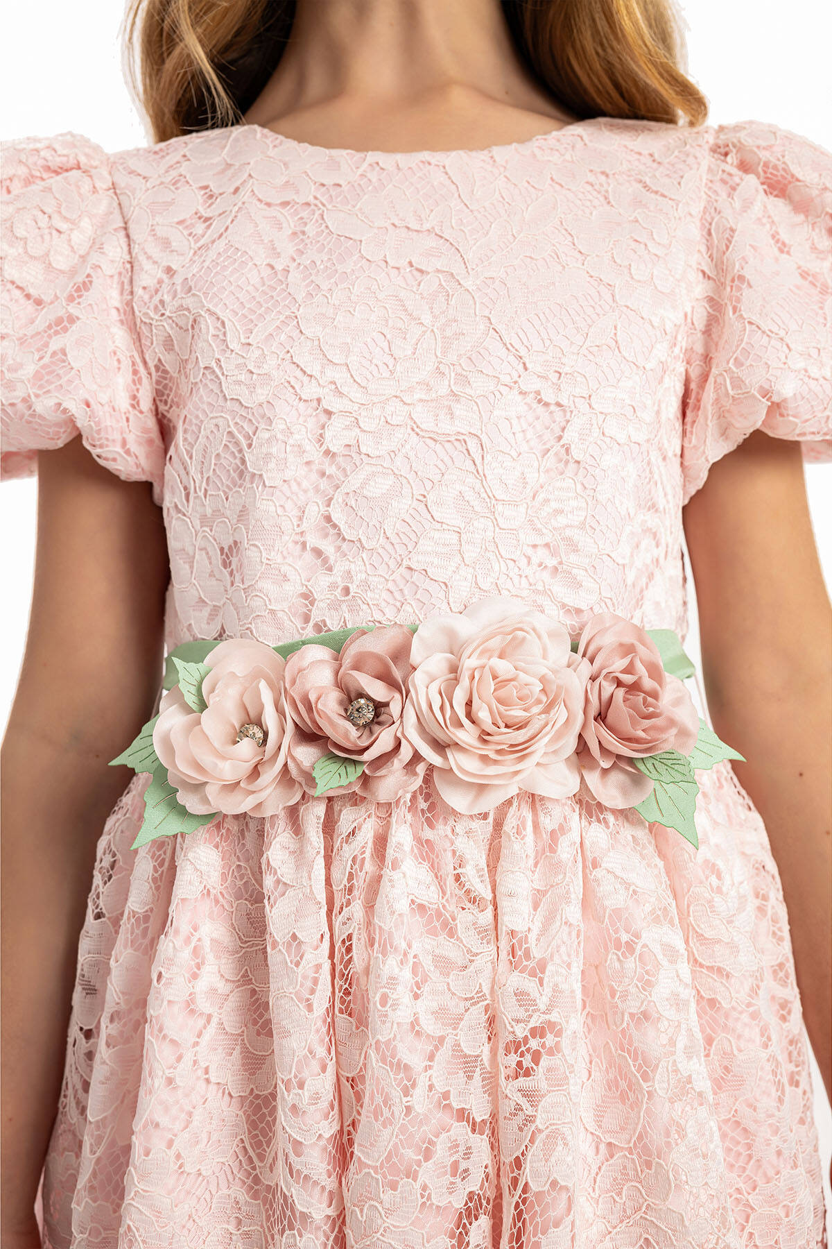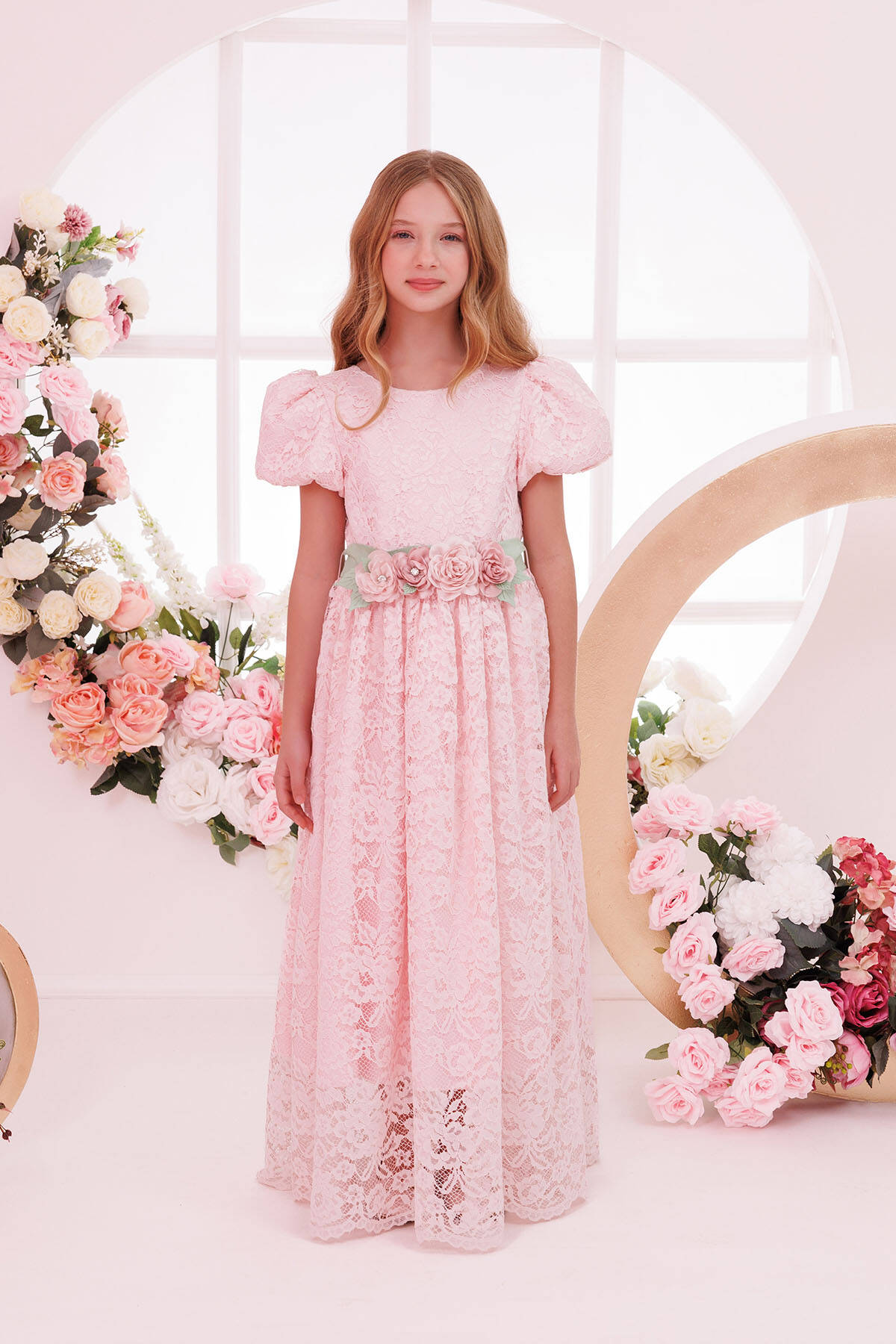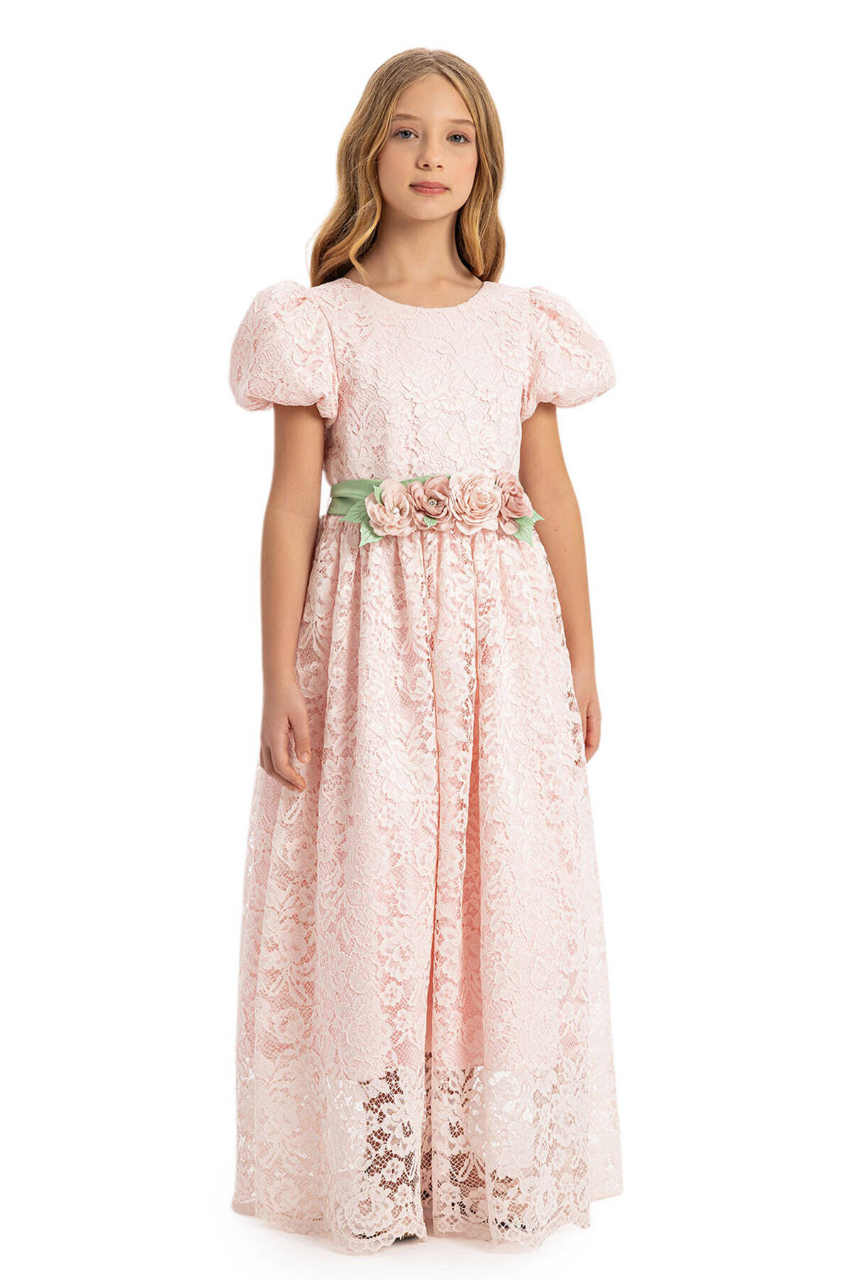 This elegant dress features delicate puff sleeves and an intricately detailed floral lace overlay, creating a timeless and graceful look. A highlight of the design is the floral belt adorned with soft petals and a satin bow at the back, adding a refined touch of color. This long-length dress offers sophistication and comfort, making it the ideal choice for weddings, birthdays, or any formal gathering.