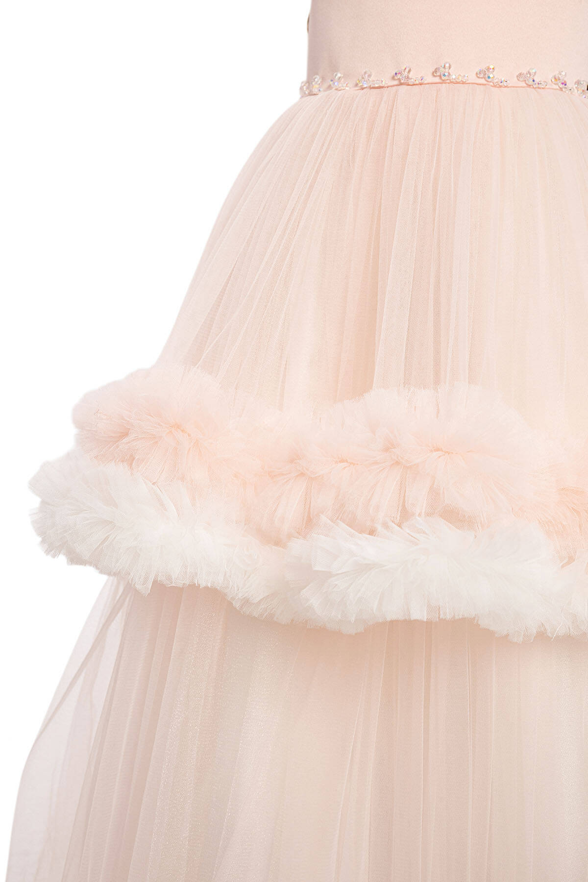 Let your little one shine in this elegant dress, perfect for any special occasion! Featuring a soft floral-embellished bodice and a flowing tulle skirt with delicate ruffle trims, this dress combines sophistication and comfort. The cap sleeves and sheer neckline add a touch of grace, while the lace-up back ensures a perfect fit. Lightweight and breathable, this dress is ideal for weddings, birthday parties, or festive gatherings, making your child the center of attention wherever they go.
