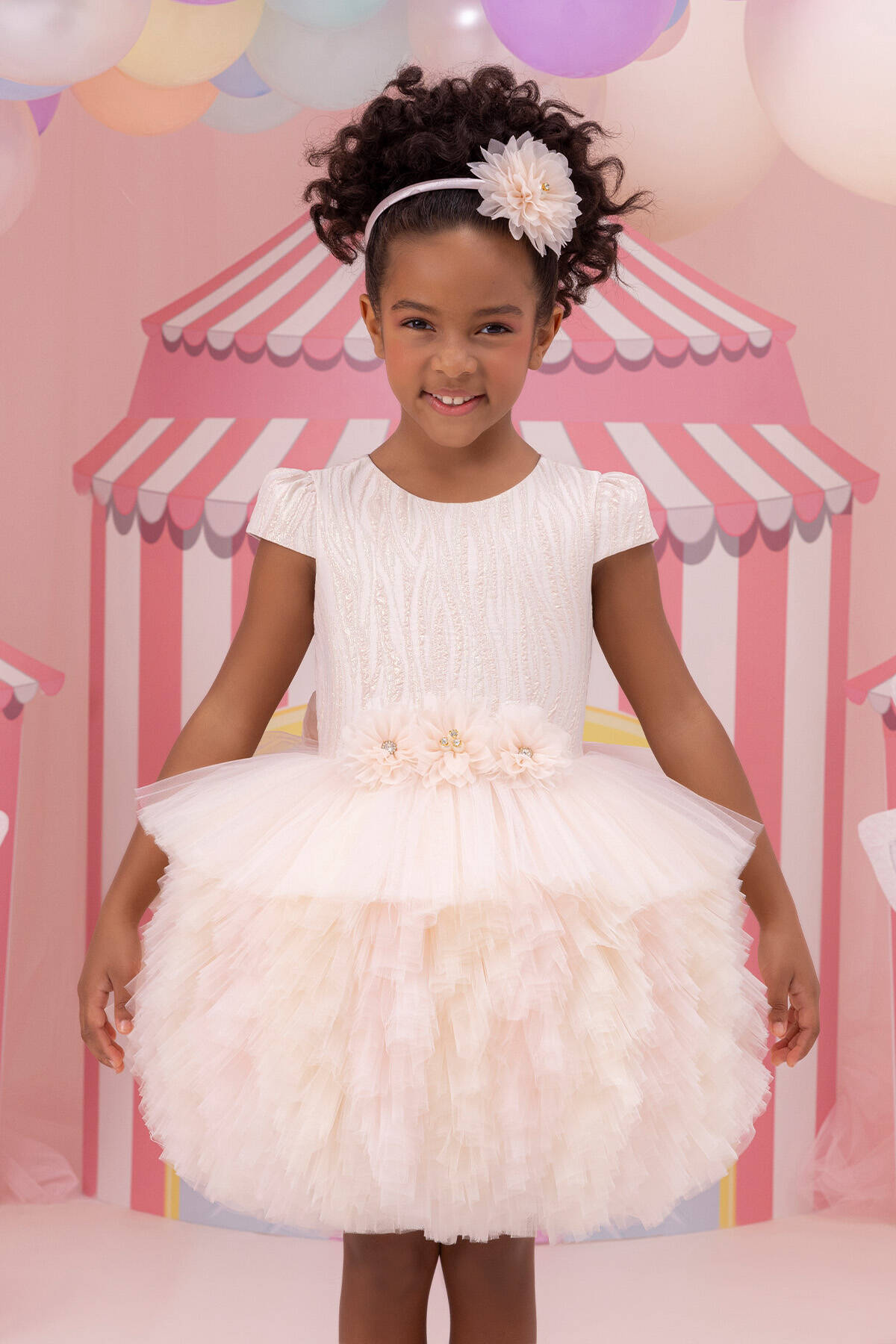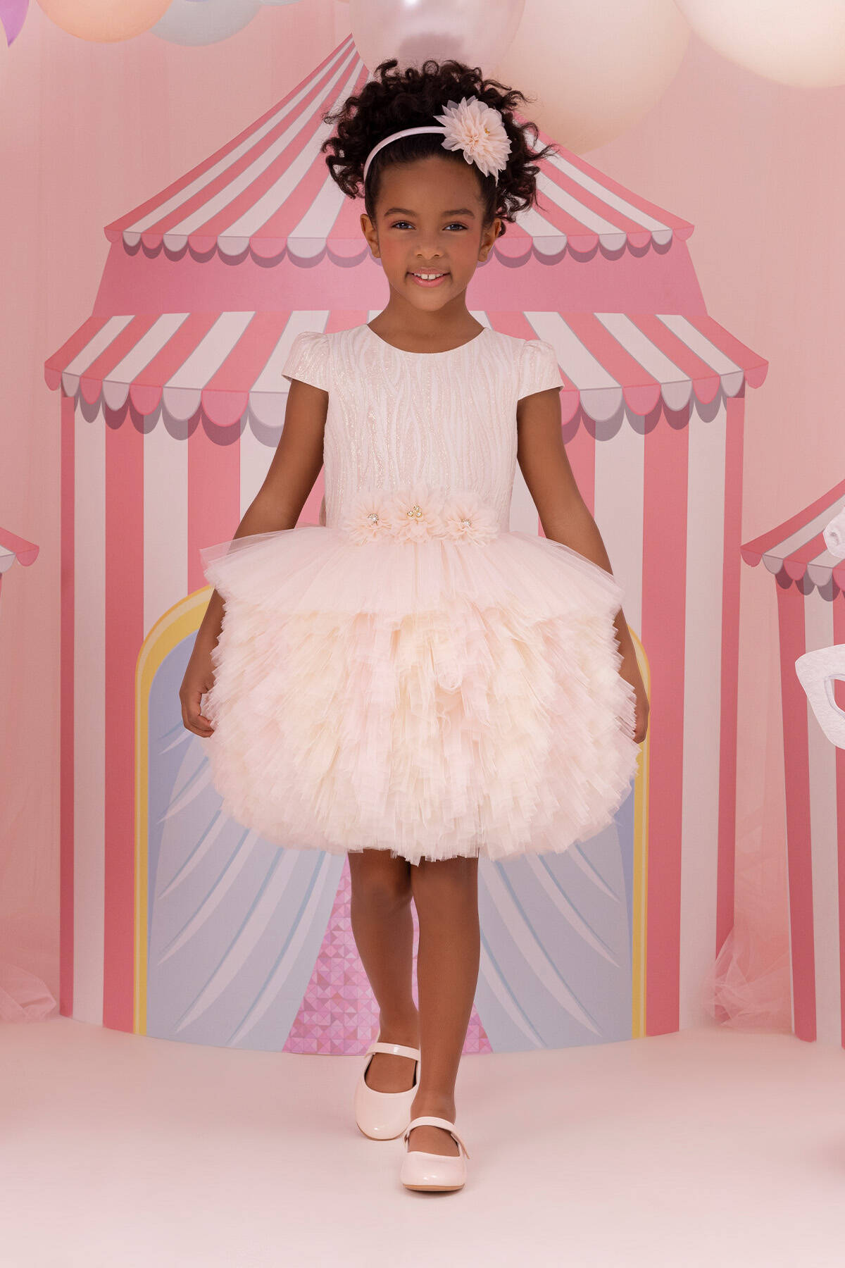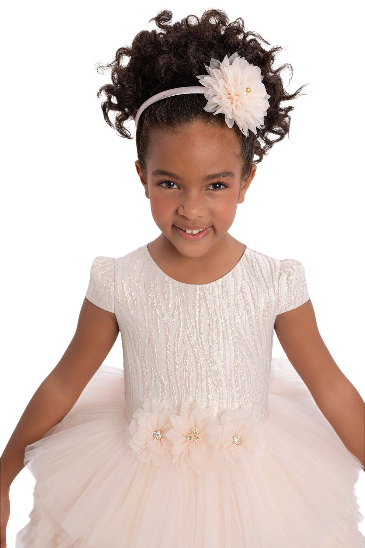 The textured jacquard fabric on the moon-sleeved dress adds a special touch. The flower details on the front and crown accessory bring a sweet charm to the dress. The layered tulle skirts of the dress, designed with a voluminous form, capture all the attention. Ready to take its place in wardrobes, the tutu girl's dress is the star of the spring-summer season. With its elegant back bow and adorable hair accessory, children will adore this dress. The dress is comfortable and healthy with its 100% cotton lining. A stylish choice that can be used as a birthday dress, party dress, or special occasion attire.