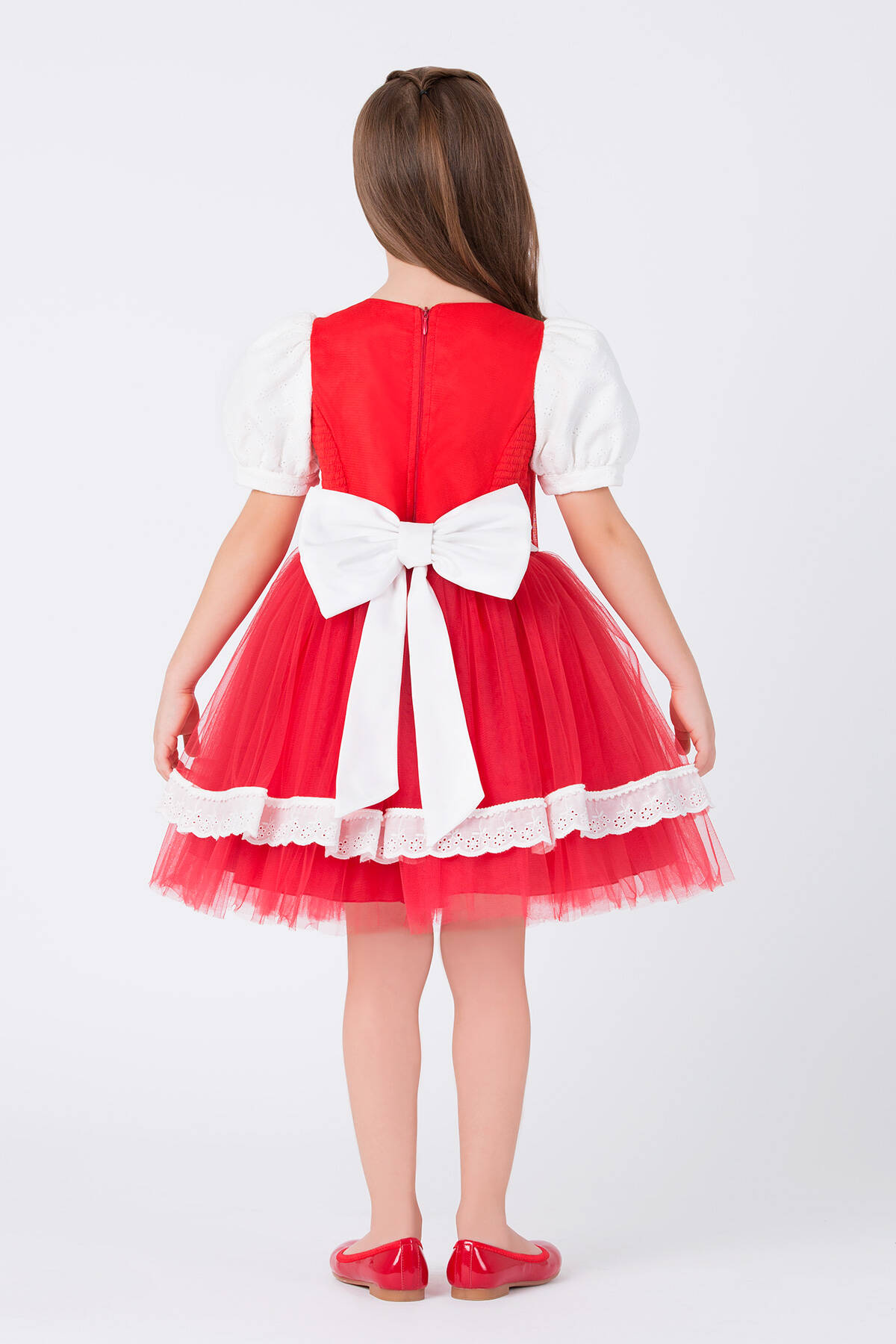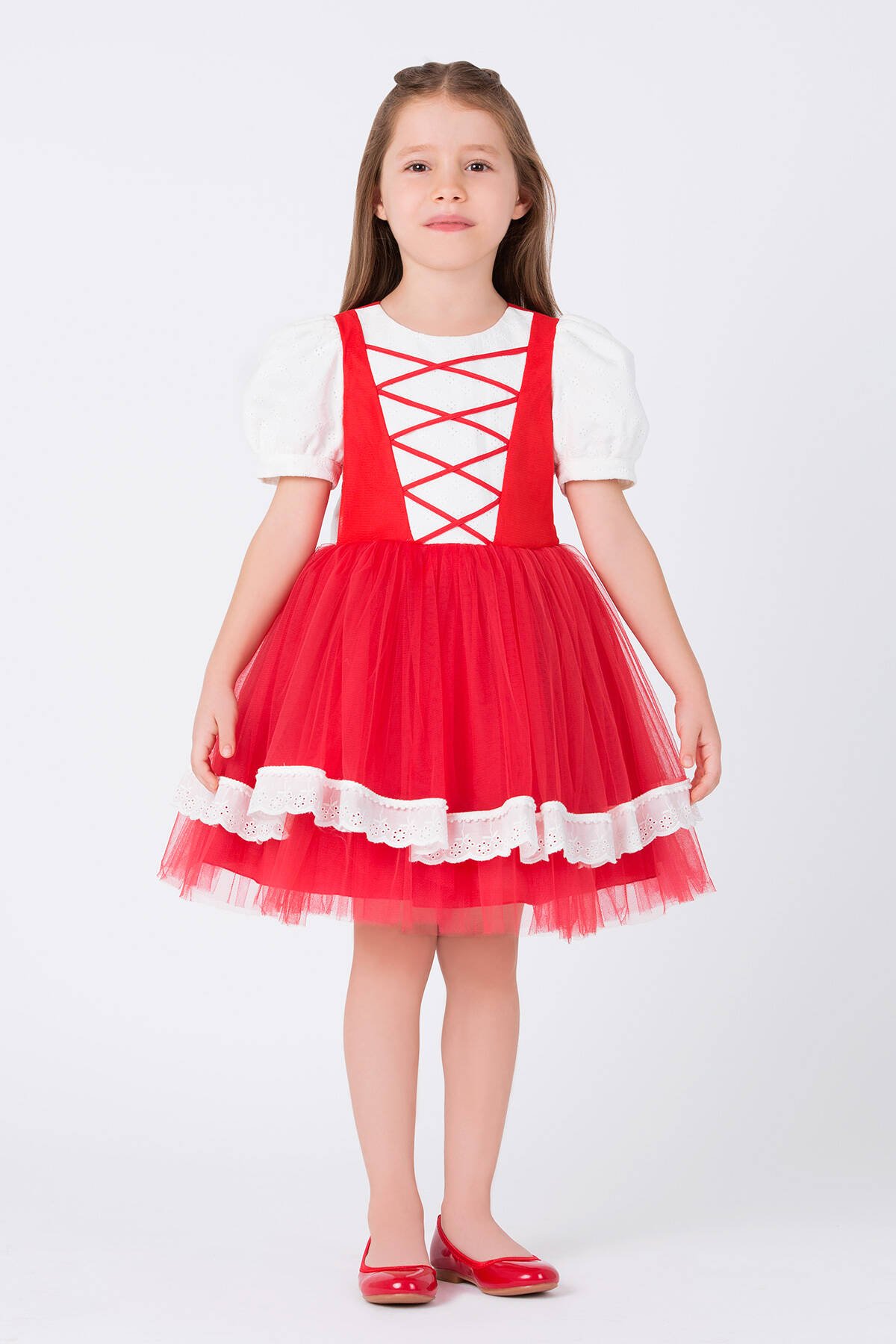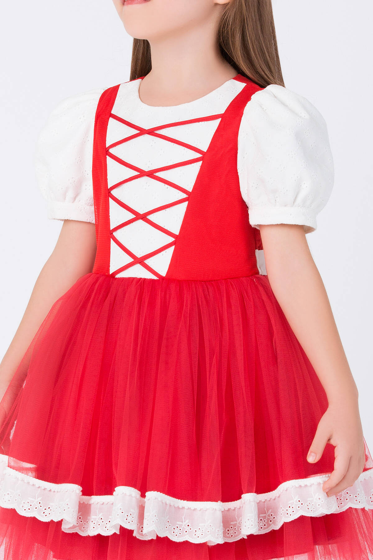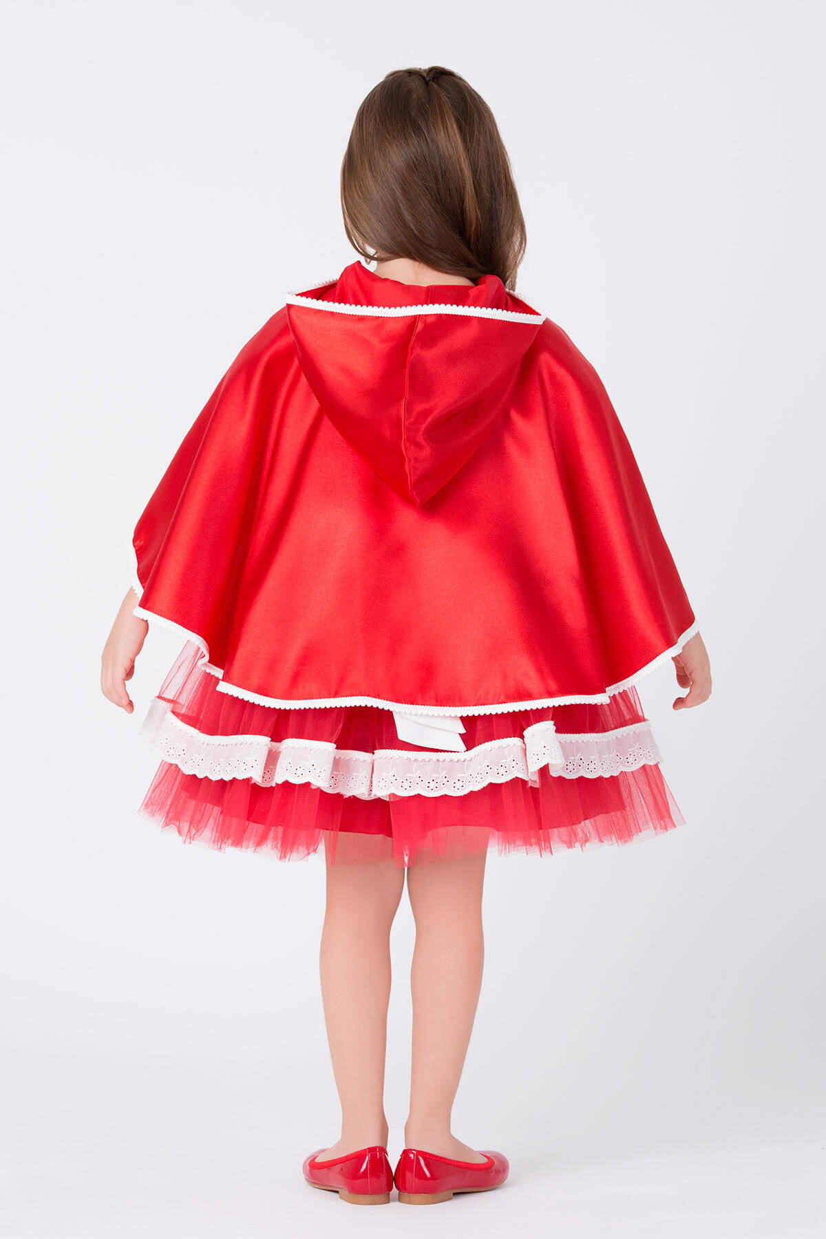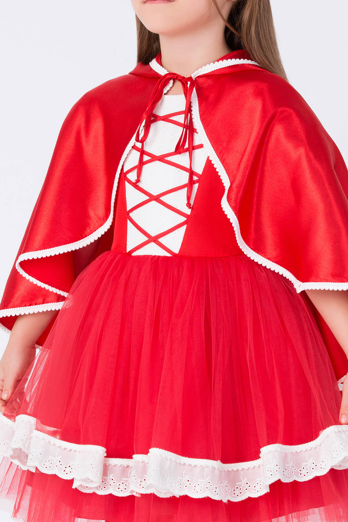 We have designed a stylish costume for girls that can be chosen for themed school parties, cartoon-themed birthday celebrations, or photo shoots. We combined red and white colors for our dress. The red hooded cape girl costume features puffed sleeves and red ribbon bands on the front bodice, which are quite eye-catching. Our elegant birthday dress is made with garnished brocade fabric. The voluminous skirt with its tulle fabric is very stylish. The lace-detailed hem and the cape make this red-hooded girl costume a special design that children will love. With a large, elegant bow on the back, the red-hooded girl dress offers comfortable wear with its elastic fabric. At Pamina, we care about children's health as much as their style, and we use healthy fabrics in our products