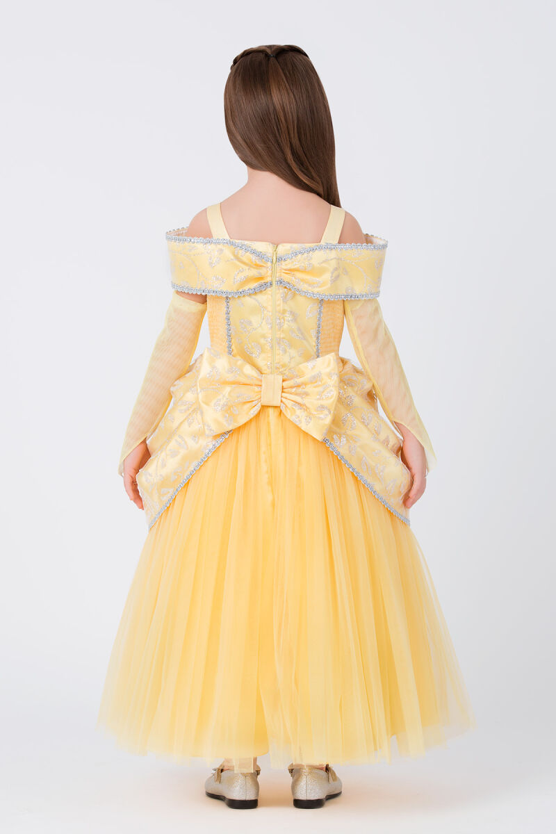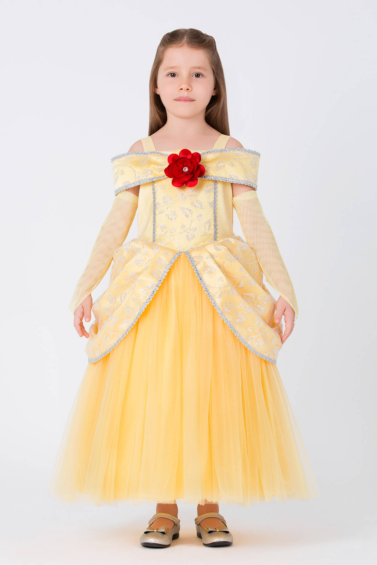 We have designed an extravagant princess dress that girls can wear for special celebrations. The princess-neck halter dress features an elegant flower accessory on the bodice. The dress, sparkling with glitter-printed motifs, could be a very stylish choice for a themed birthday. The satin dress with glittery straps dazzles with its sparkling details. Our elegant dress, suitable for birthday or party wear, also offers comfort with the elastic detail on the back bodice. The dress, with its long, voluminous tulle layers, is a stylish design that will catch everyone's eye at costume parties. Completed with chic gloves, our yellow costume will make girls feel truly special. Designed for girls aged 3-7, this dress is a design that children will love to wear on their special days. At Pamina, we care about both the style and the health of children, and we prioritize using healthy fabrics in our products.