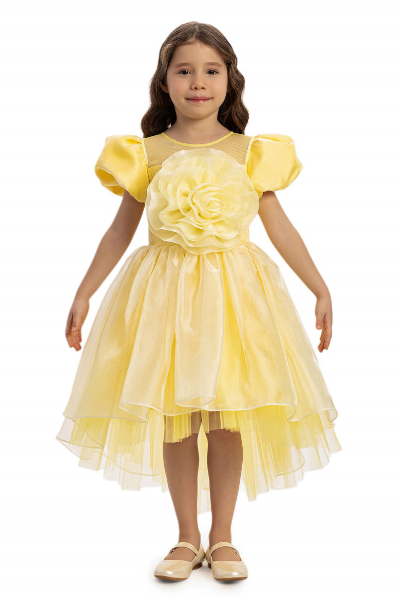 The centerpiece of the design is a stunning oversized flower embellishment on the bodice, perfectly complemented by puff sleeves and a sheer neckline for added charm. The layered skirt features a delicate high-low hem, creating graceful movement and a whimsical silhouette. The lace-up back detail adds an extra touch of sophistication, ensuring a perfect fit while enhancing the overall design. Whether for birthdays, parties, or other special occasions, this dress offers the perfect blend of style and comfort.